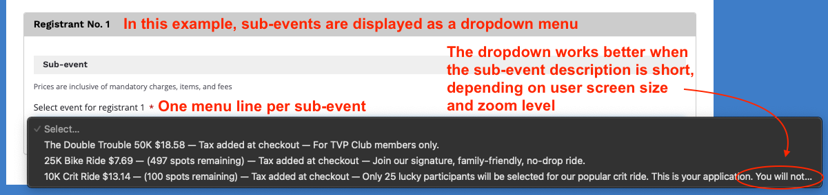 - toggle on: sub-events are displayed as a dropdown menu; the sub-event name and (if applicable) limits, price, pricing description and sub-event description will all have to fit in one menu line (therefore, it's best for very short descriptions)