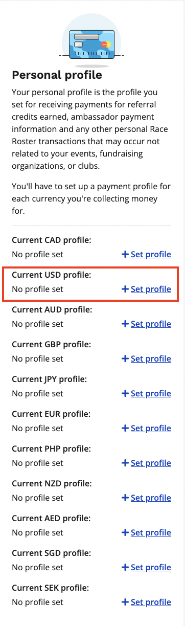 4. You will then be taken to the payment information section. Here you will want to click Set profile next to the USD option from the Personal Profile section on the right-hand side of the page.
