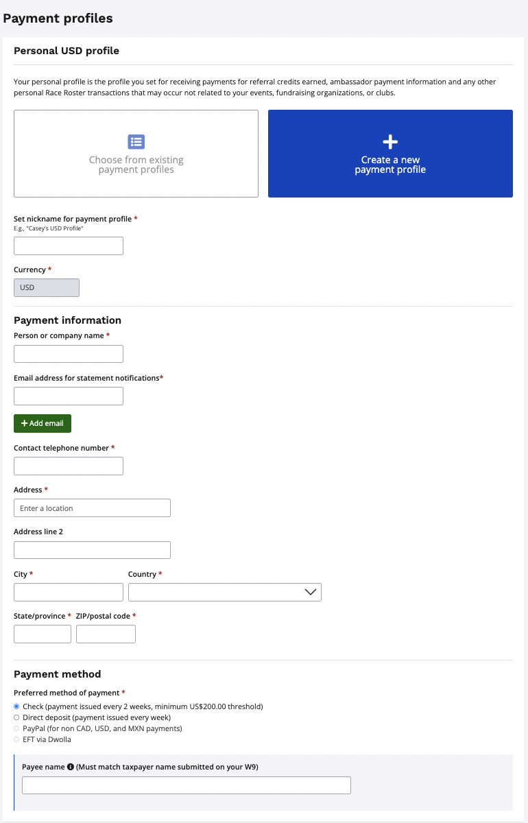 5. After selecting the USD personal profile, you will be prompted to create a Payment Profile. Please fill out any field with a red asterisk beside it. You have the option to select check or direct deposit as your payment method.
