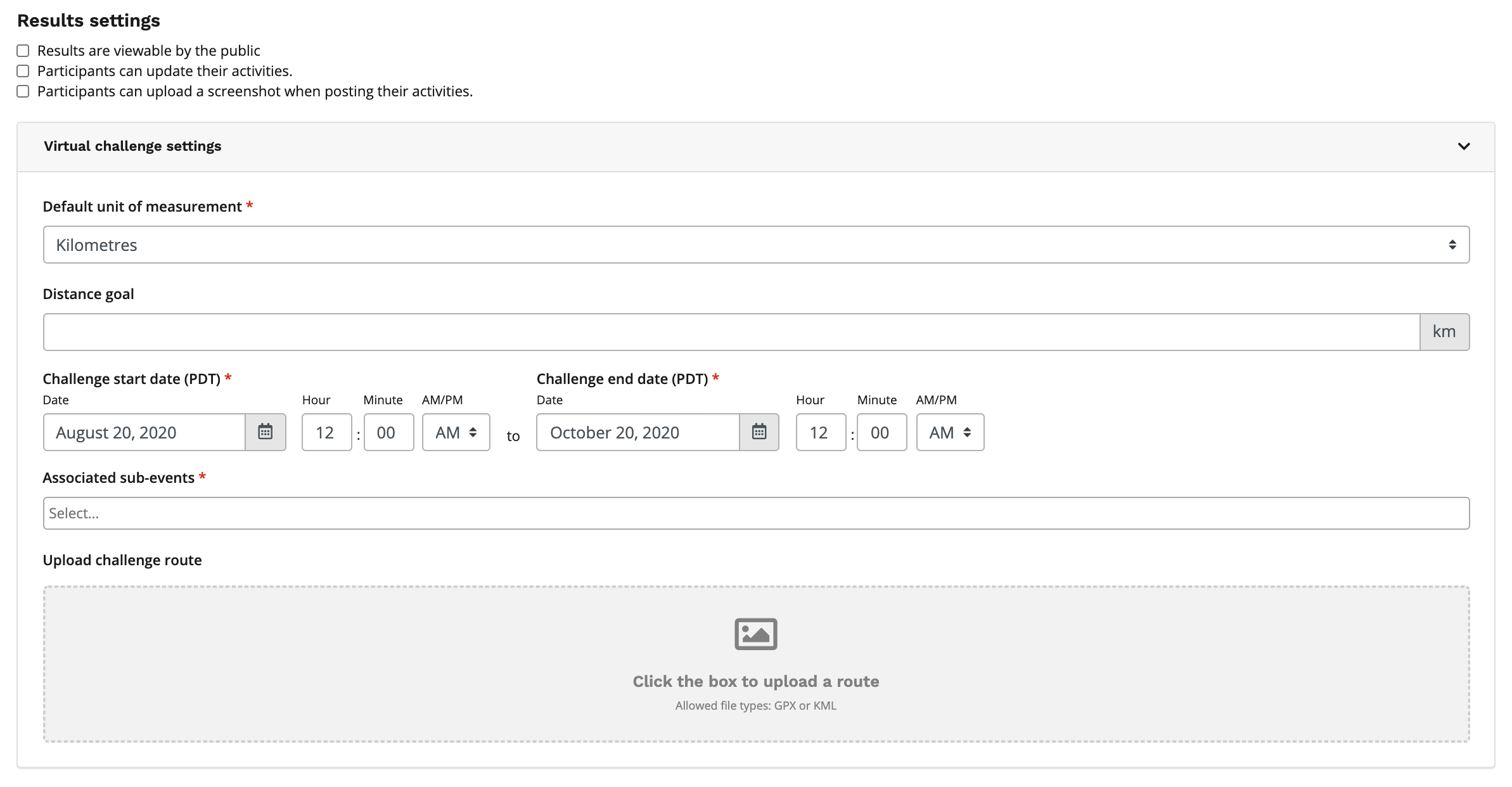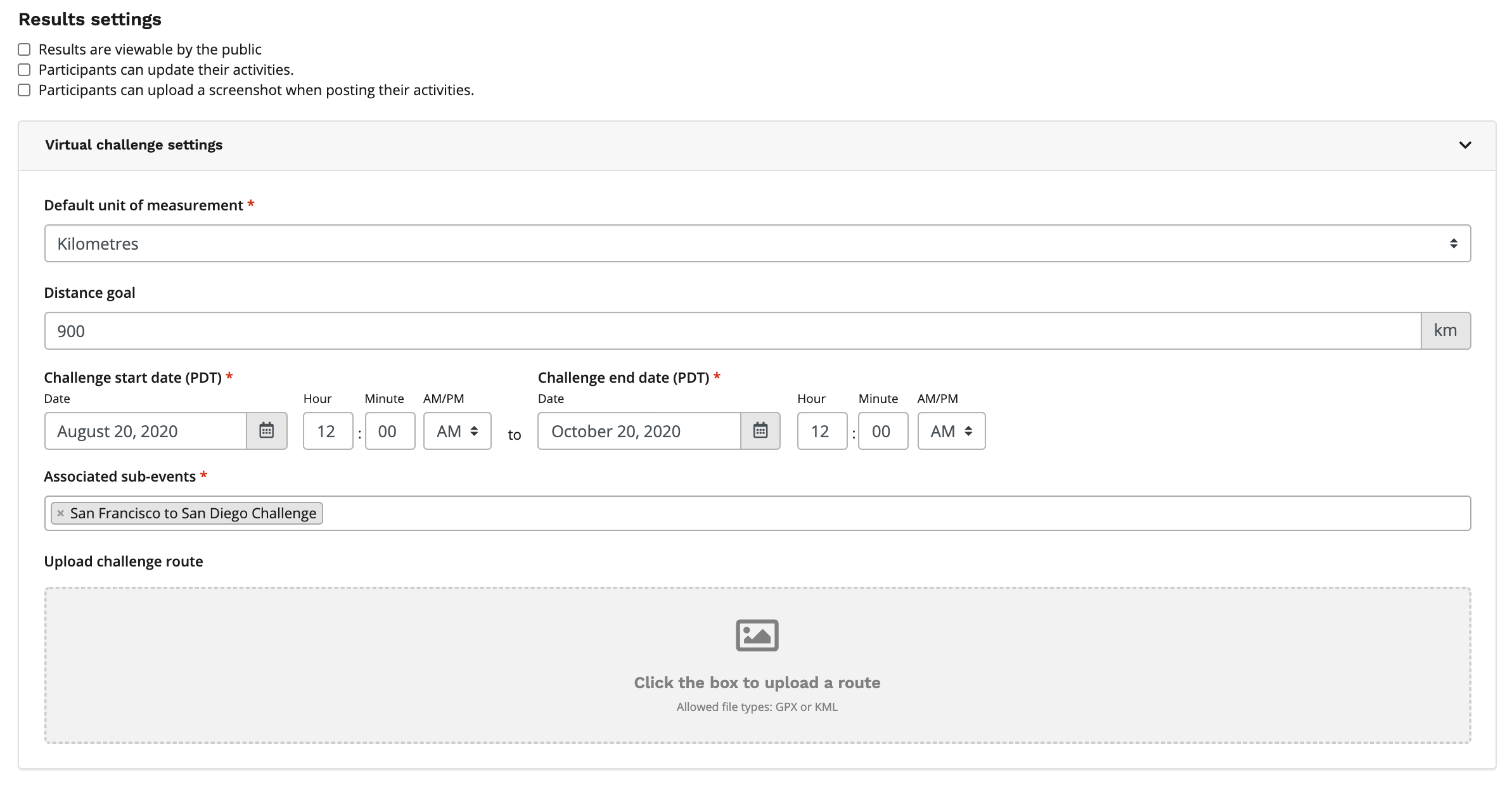 7. After you're satisfied with your Results settings, you will need to complete the fields in the Virtual challenge settings section. You will need to add/select the: