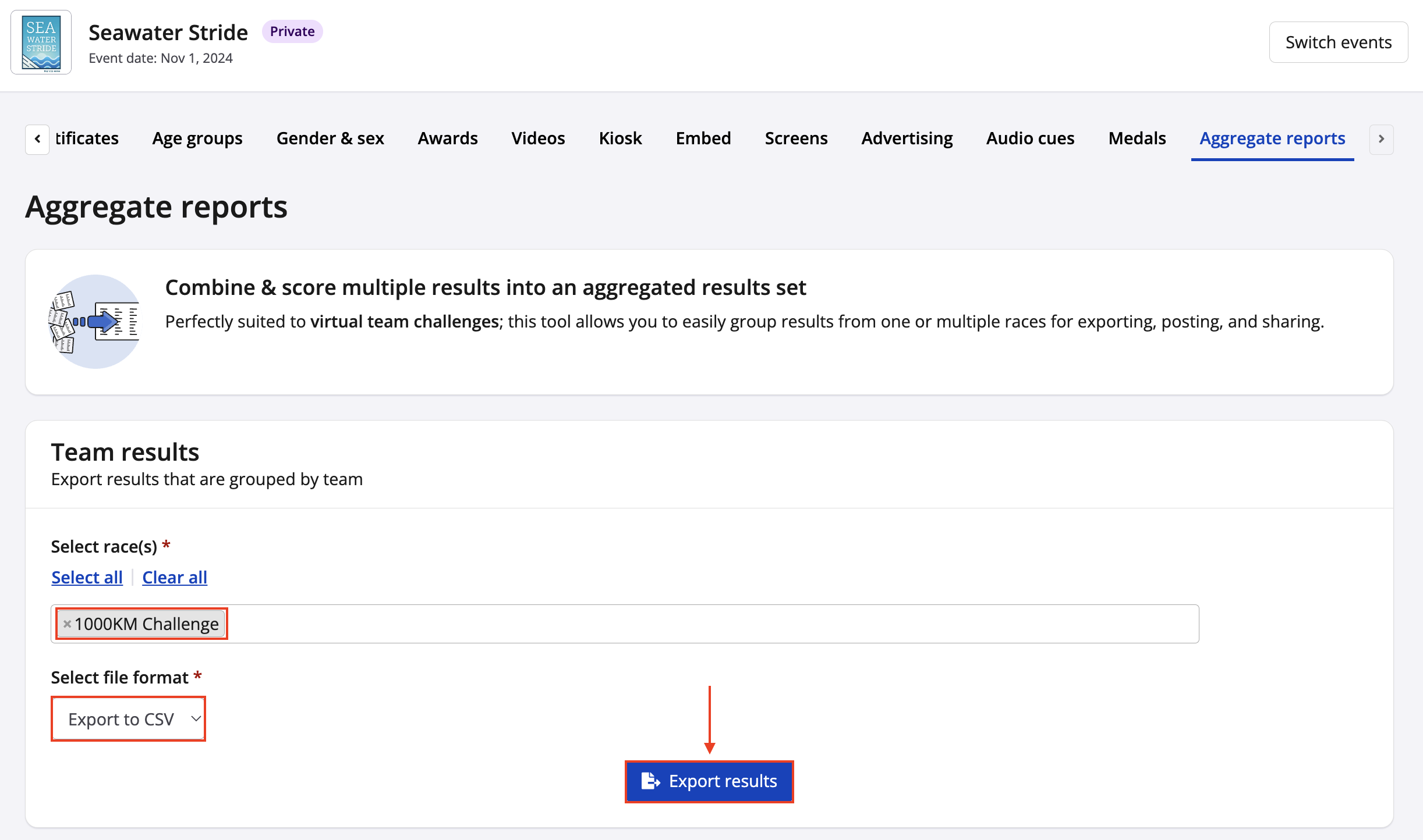 3. From your Aggregate reports settings, select the race(s) for the challenges that you wish to generate aggregate team results for. Select if you'd like to export your report as a CSV or TSV file, then click the Export results button.