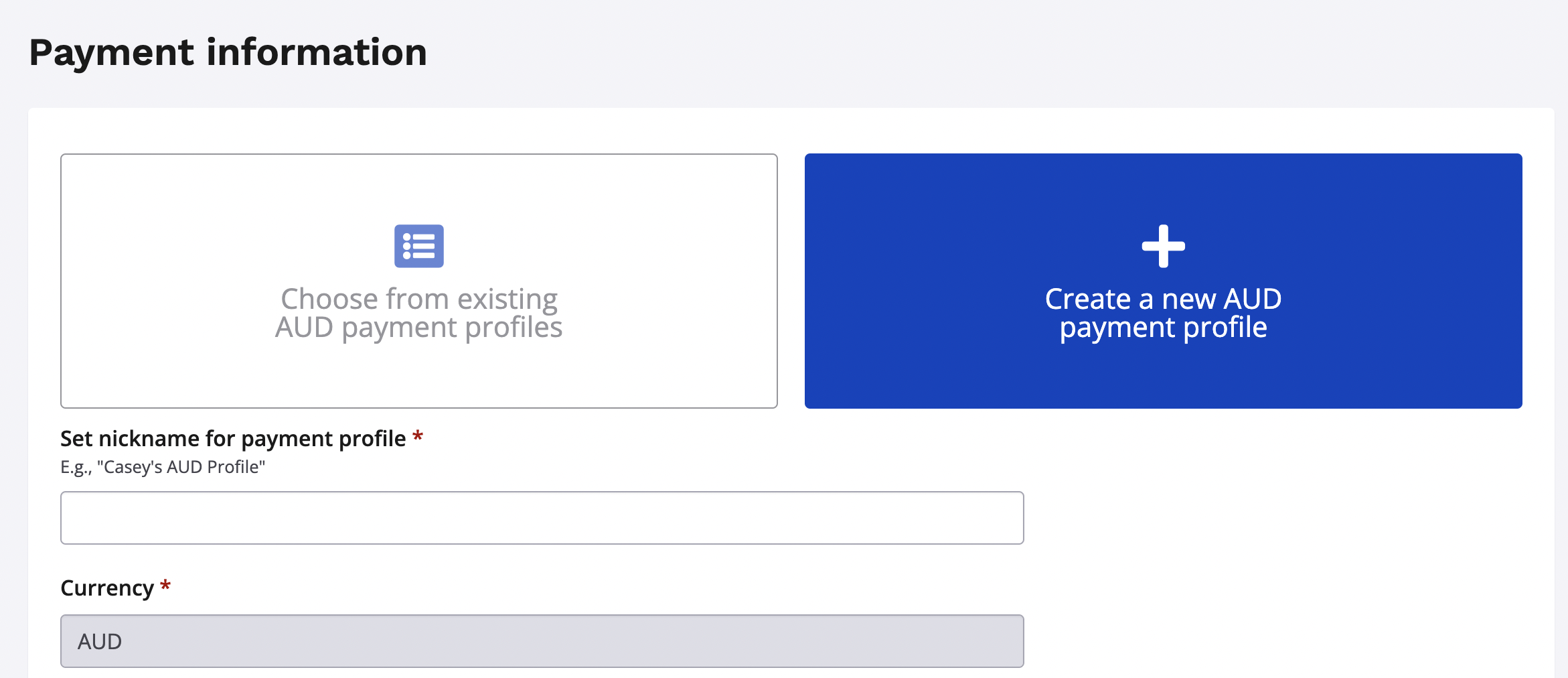 When creating a new AUD (Australian) payment profile, please follow the steps below: