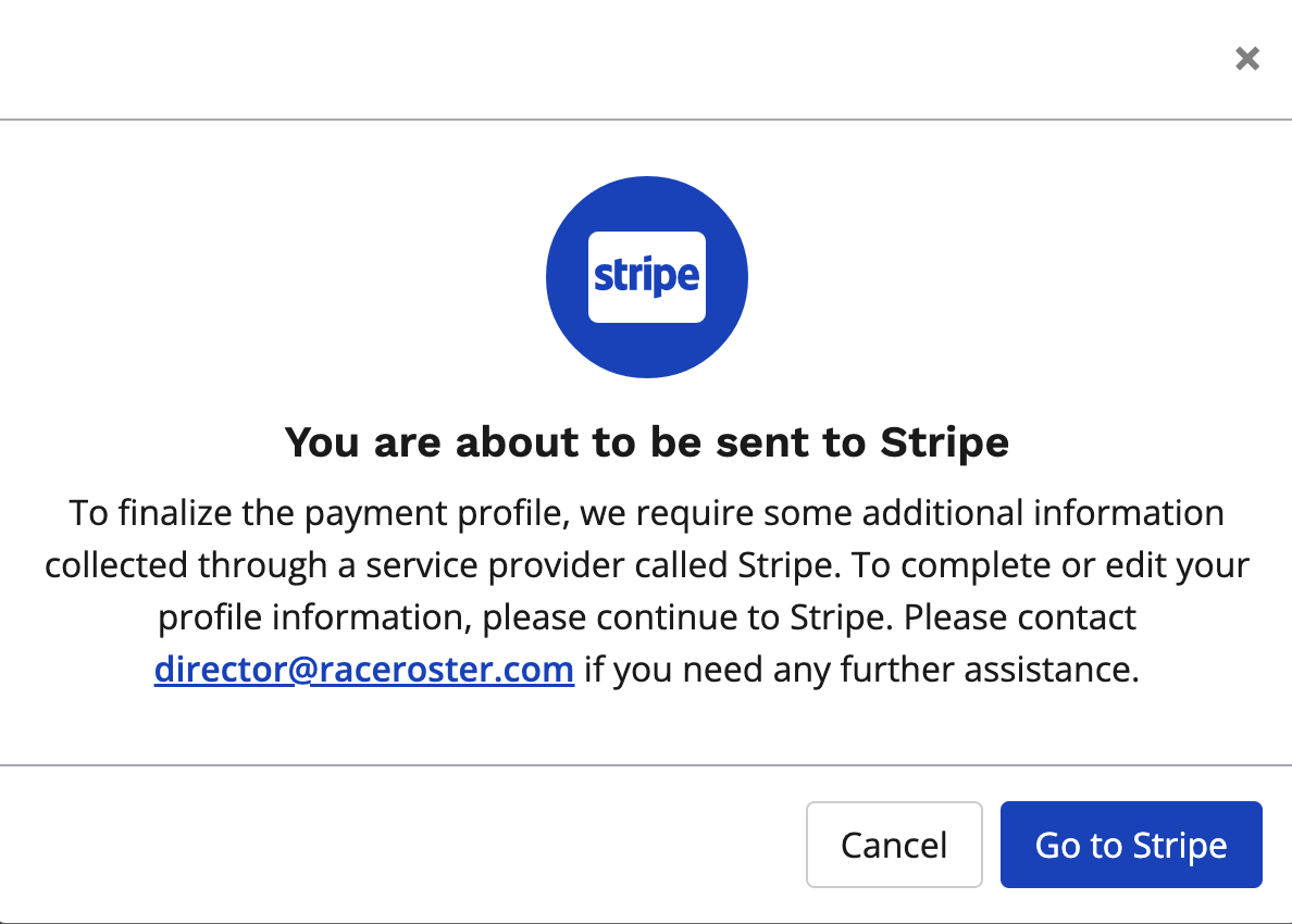 A pop-up window will appear to ask you to go to Stripe to complete your payment profile.