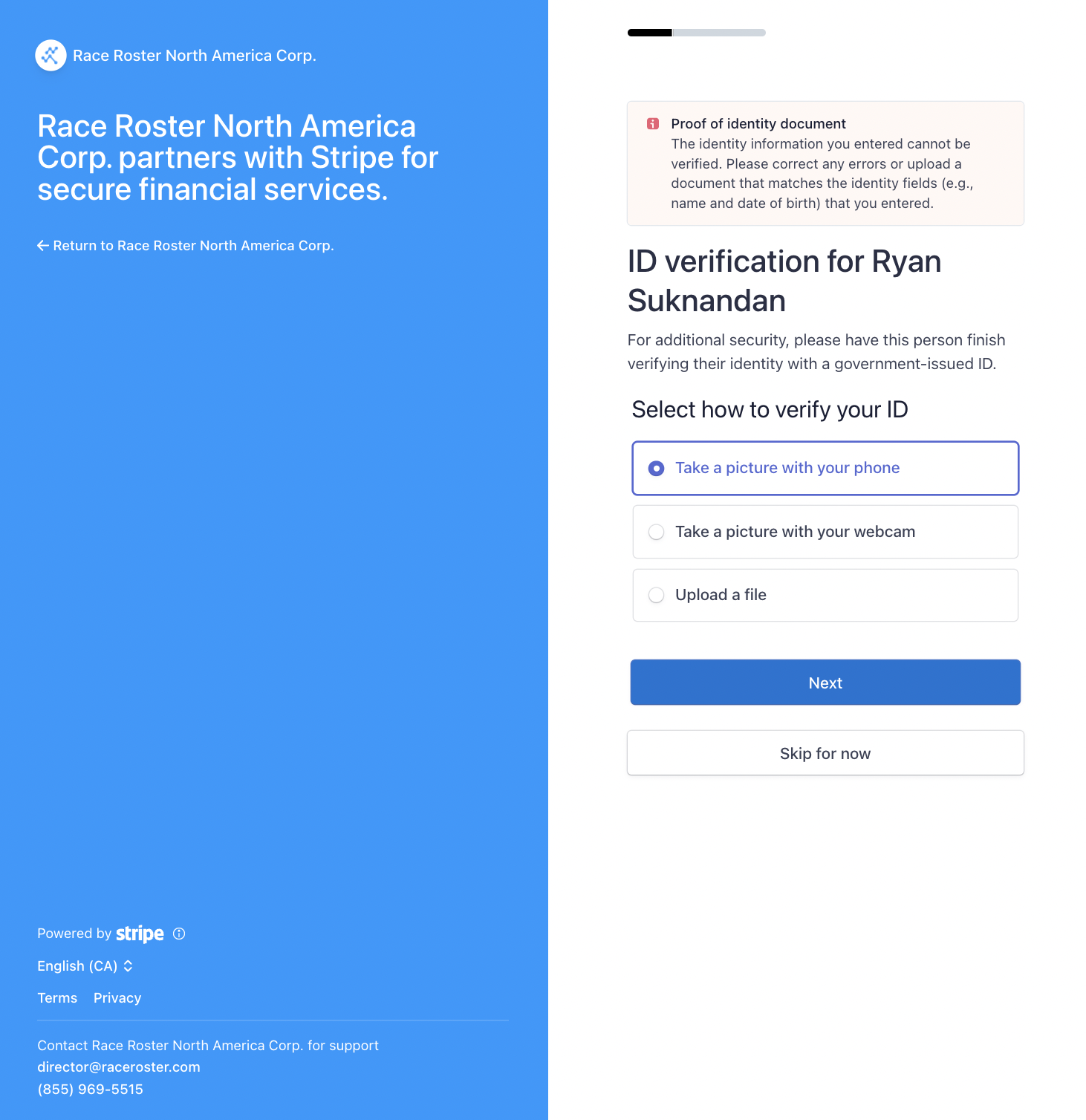 - Once the extra verification steps are complete, your payment profile on Race Roster will show pending until Stripe verifies your identity.