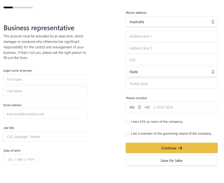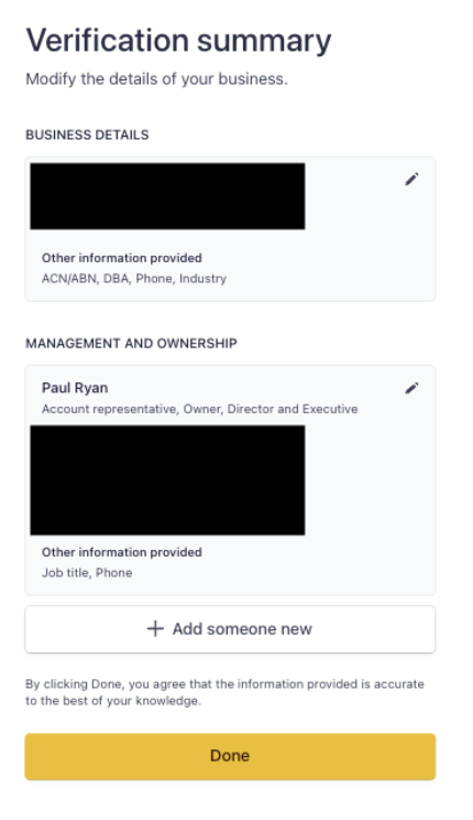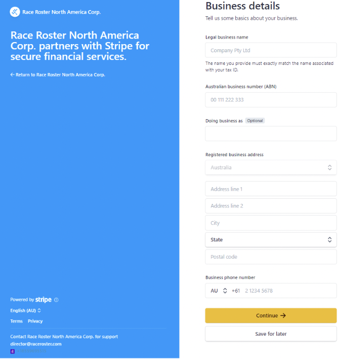 At this point you will be sent to Stripe to verify your details. You will need company or business details (names, address, phone, email and ABN) to complete this process.