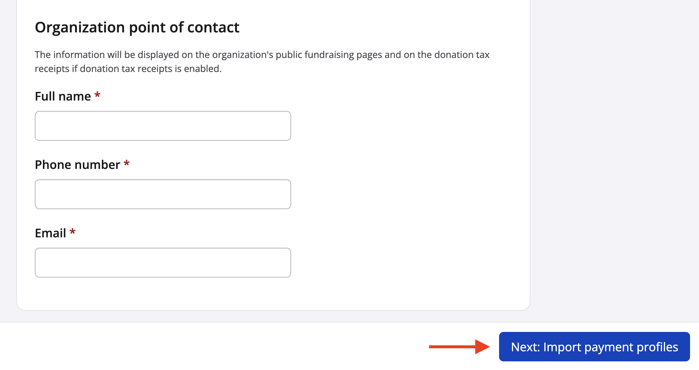 - Organization point of contact - The name and contact information for the person responsible for the organization, only public-facing when the organization has fundraising capabilities enabled