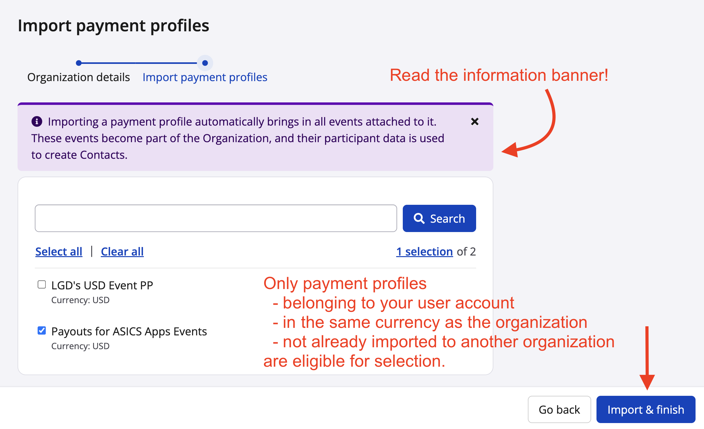 - Note 1: By importing a payment profile that is associated with a specific event's payment info section, you will automatically bring that event into the organization as well.