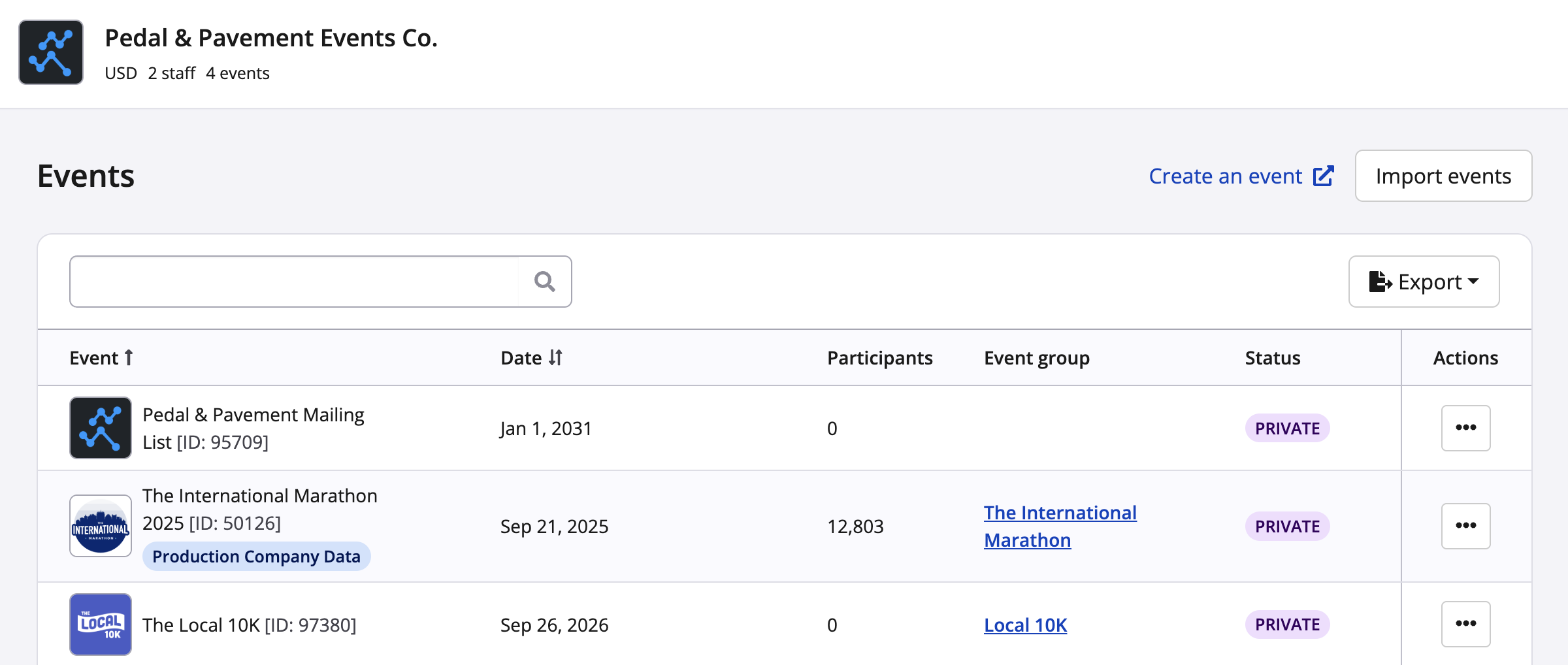 - Note: If you import events from this page, the event will not be owned by the organization and its payment profile will not be imported. It will appear labelled as "Production Company Data", meaning that dashboard metrics and contacts will be visible, while payment information will not.