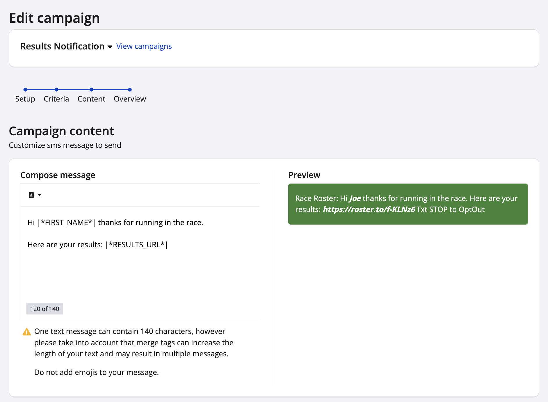 6. Next is the content step. Here you can compose your message. You can also use merge tags to customize your message to the participant. Please note that one text message can contain a maximum of 140 characters. Merge tags can also increase the length of your text and may result in multiple messages. Do not add emojis to your message as this will cause sending and display issues.