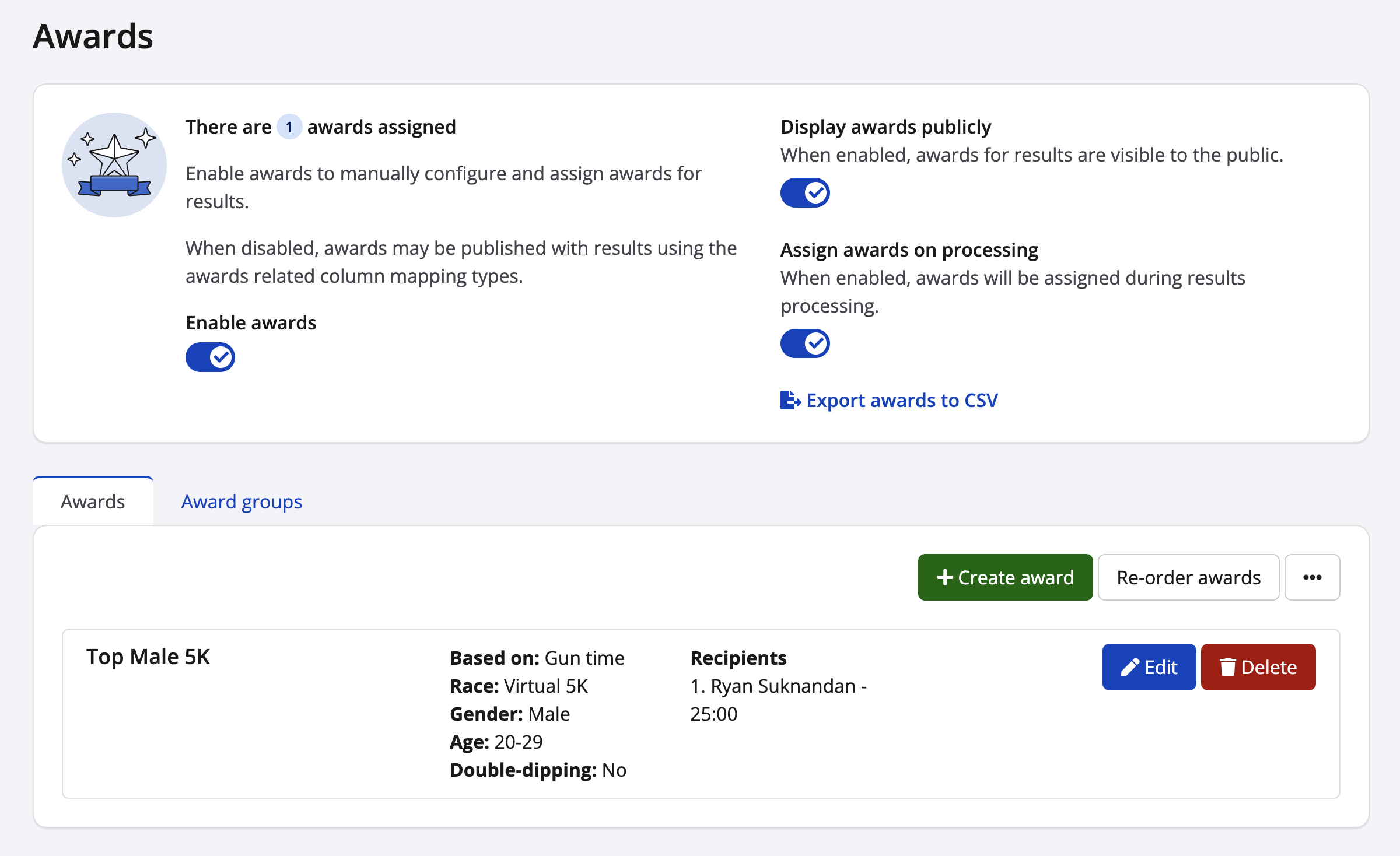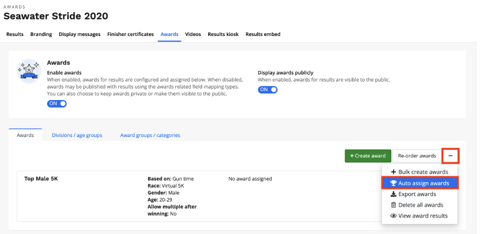 Your awards will be assigned to the appropriate finishers based on your settings of the award. You can also keep re-assigning the awards to update the award winners.