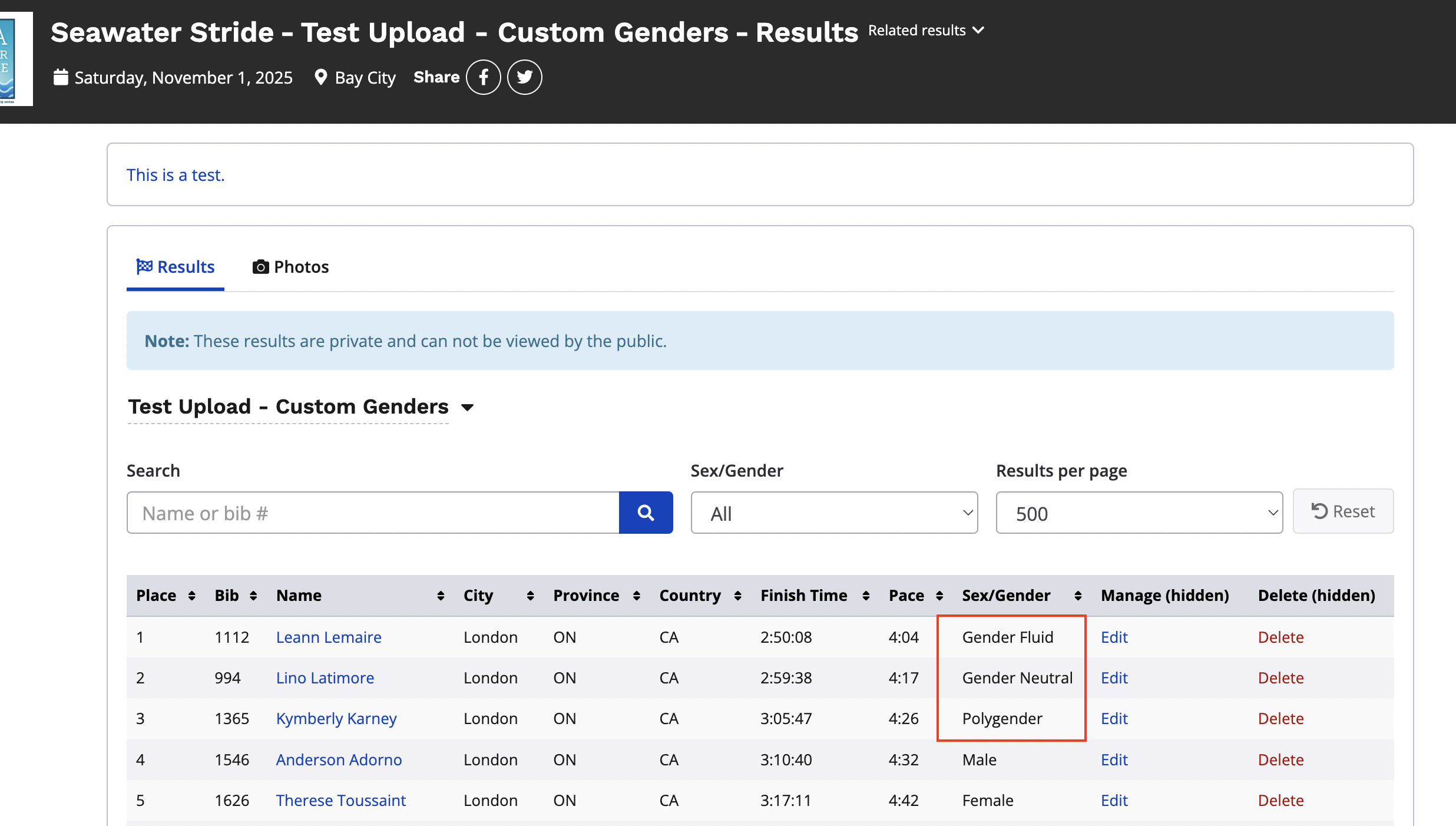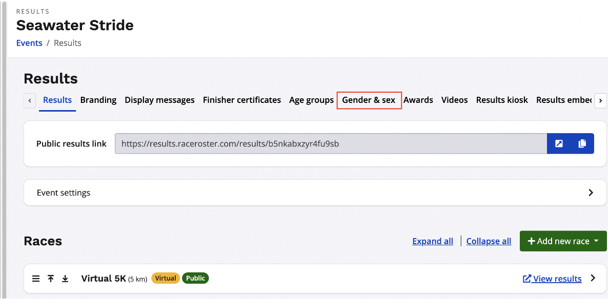 5. After the upload is complete, your structured results will now be visible from your event's results page, and your custom genders that were included in your results upload will now display under your event's sex & gender settings within your results dashboard.