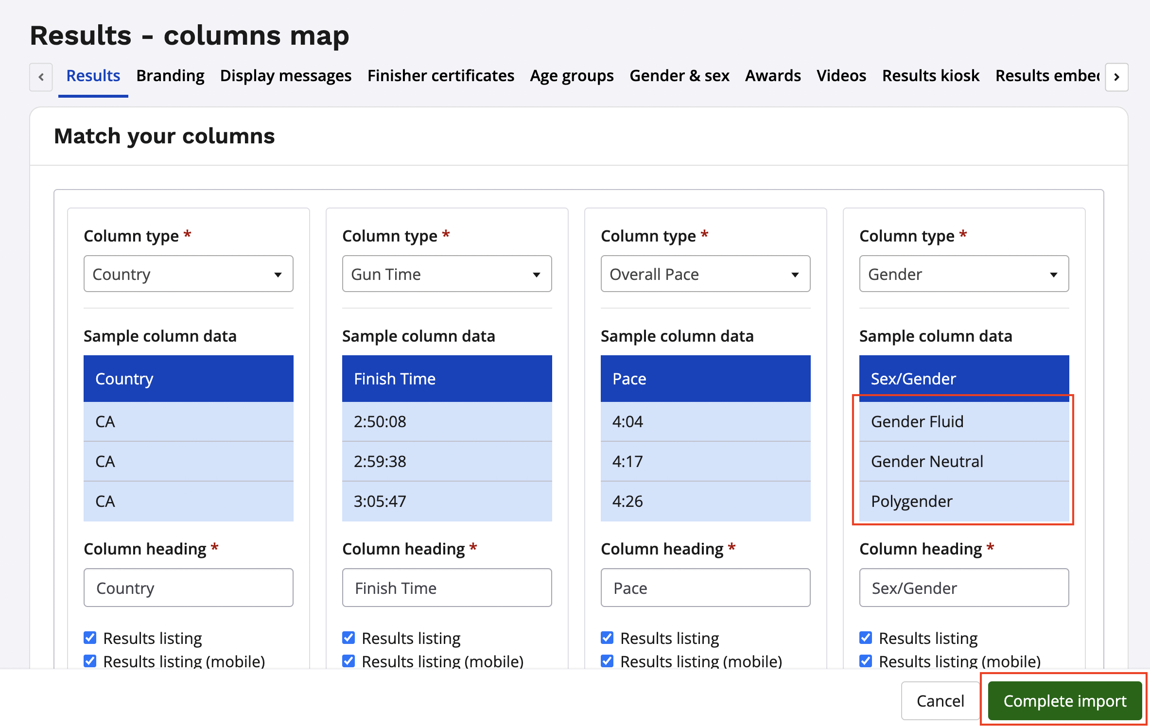 4. Match the columns from your results data to the column types displayed to ensure that your data is uploaded accurately to the results page. Click complete import once you have matched all of your columns and are ready to upload the results data.