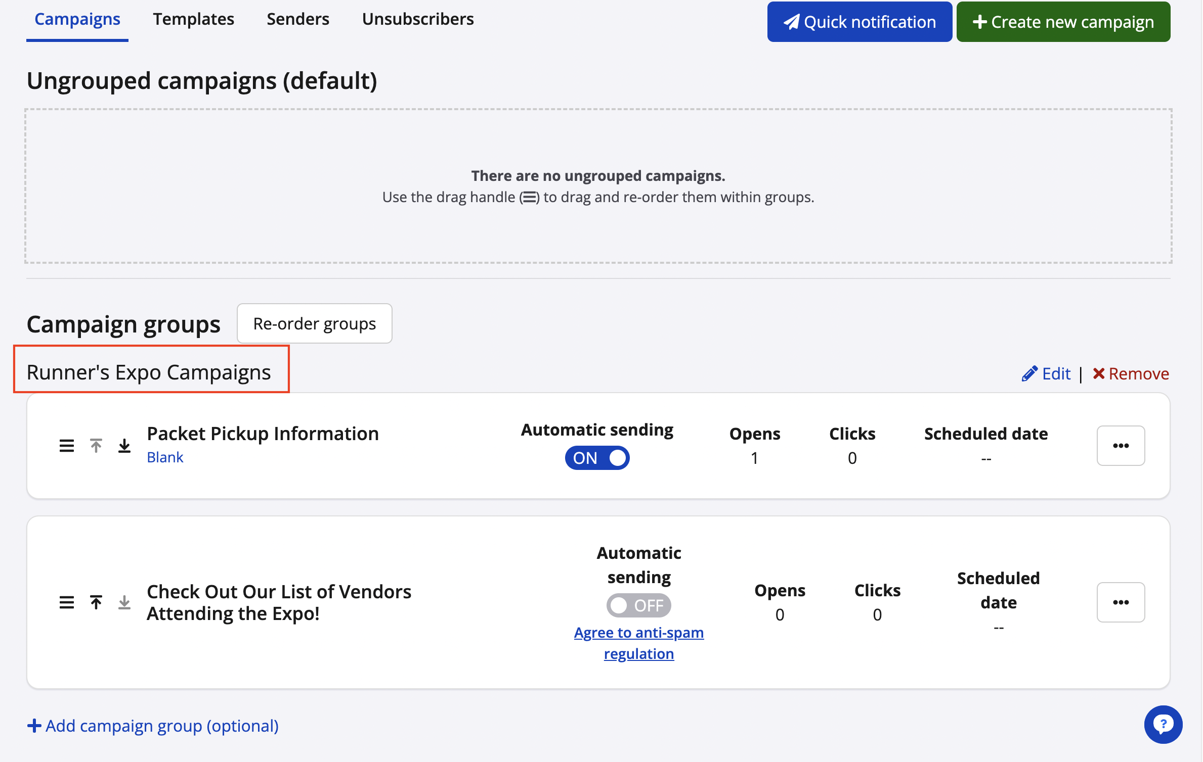 Race Roster has added functionality to allow for the creation of email campaign groups. This feature allows event organizers to group their email campaigns in any way that allows for improved organization and categorization. Event organizers can group campaigns based off of different languages, specific sub-events, or any category they see fit.