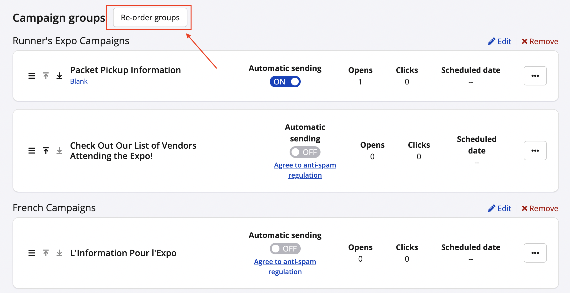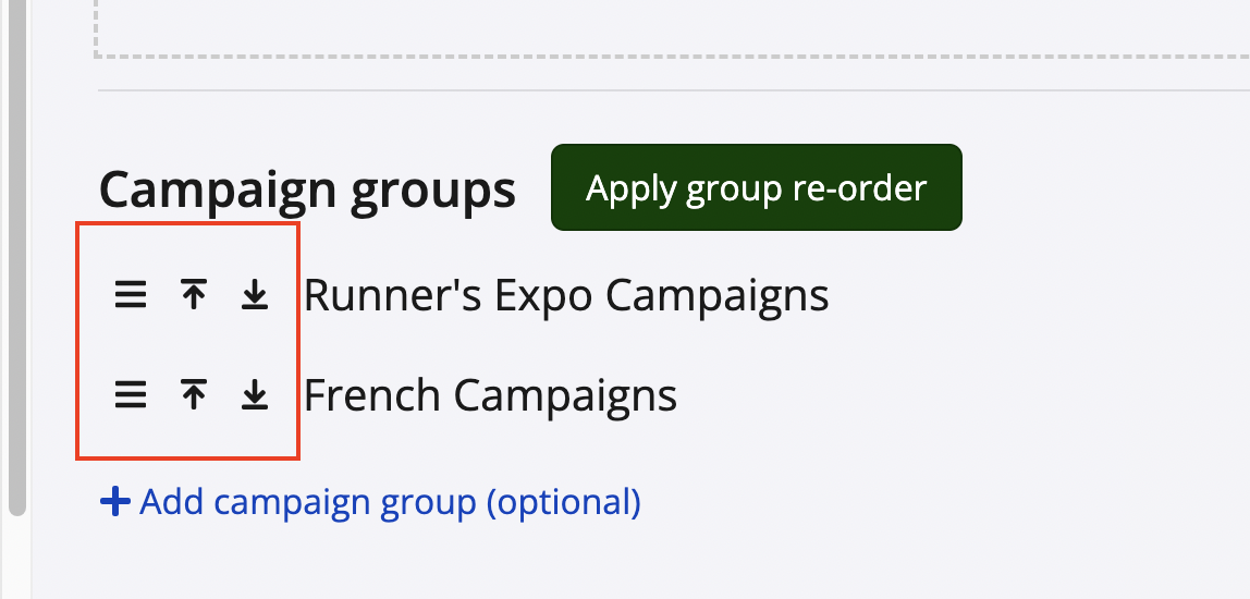 5. If you have multiple campaign groups created, you can also re-order the groups themselves by clicking the white "Re-order groups" button for further customization