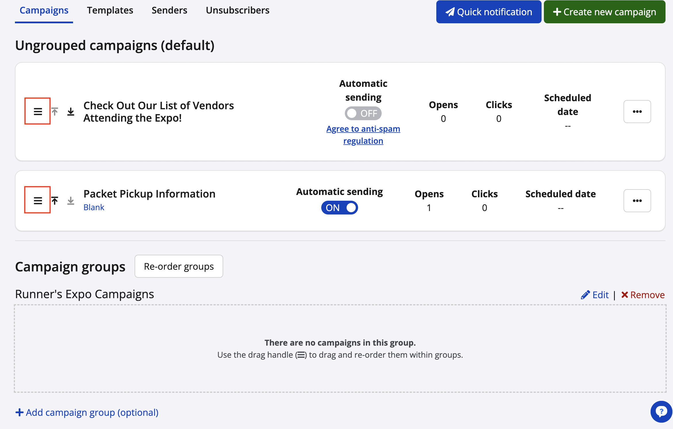 4. Use the icons on the lefthand side of the page to drag and drop your campaigns into different groups as needed