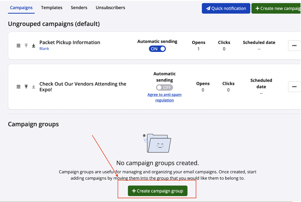 2. From your email campaign landing page, you can either create a new email campaign (view our knowledge base article HERE to create a new campaign), or, you can use any of your pre-created campaigns to begin creating groups.