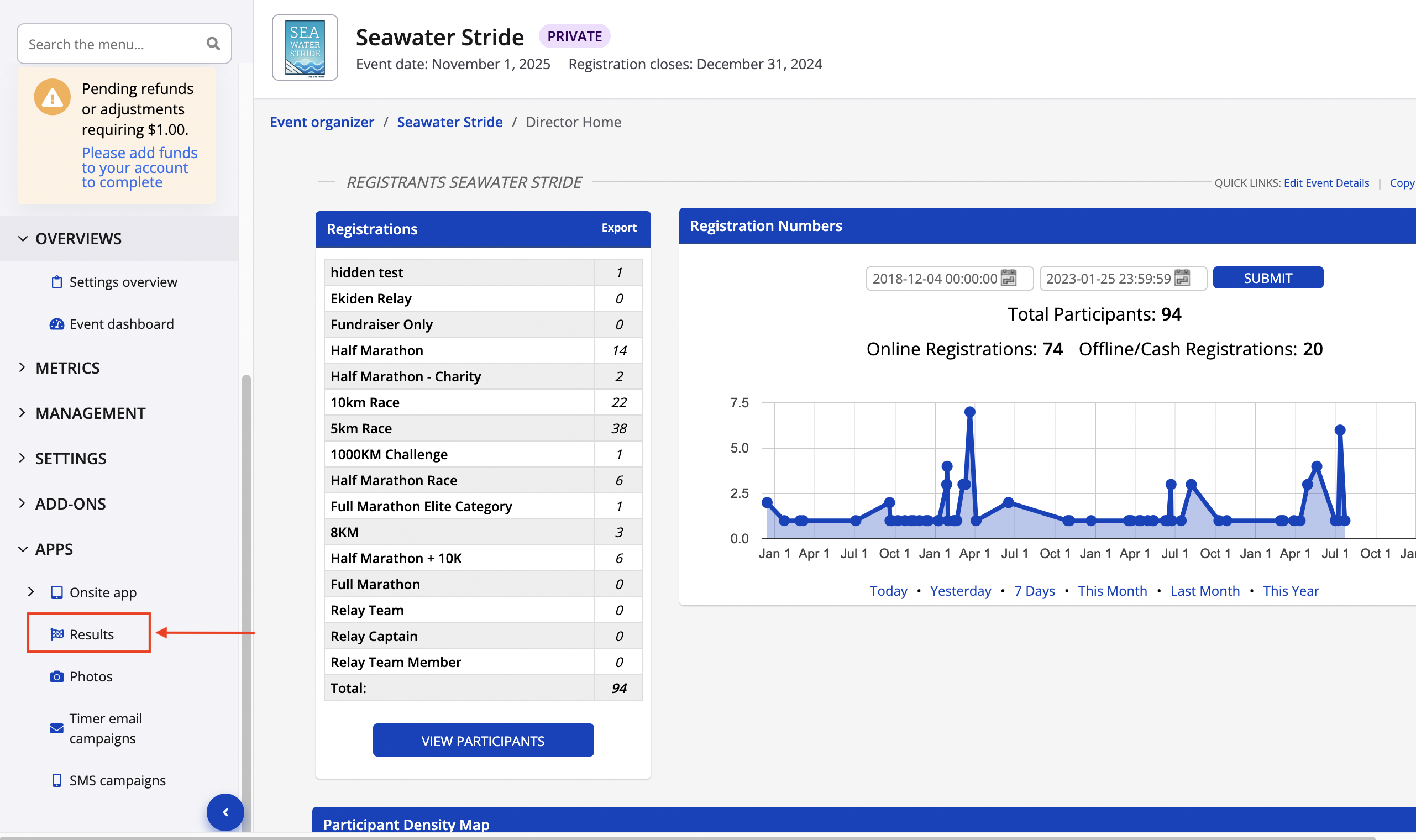 1. From your event dashboard, click on results under the apps tab from your lefthand side menu