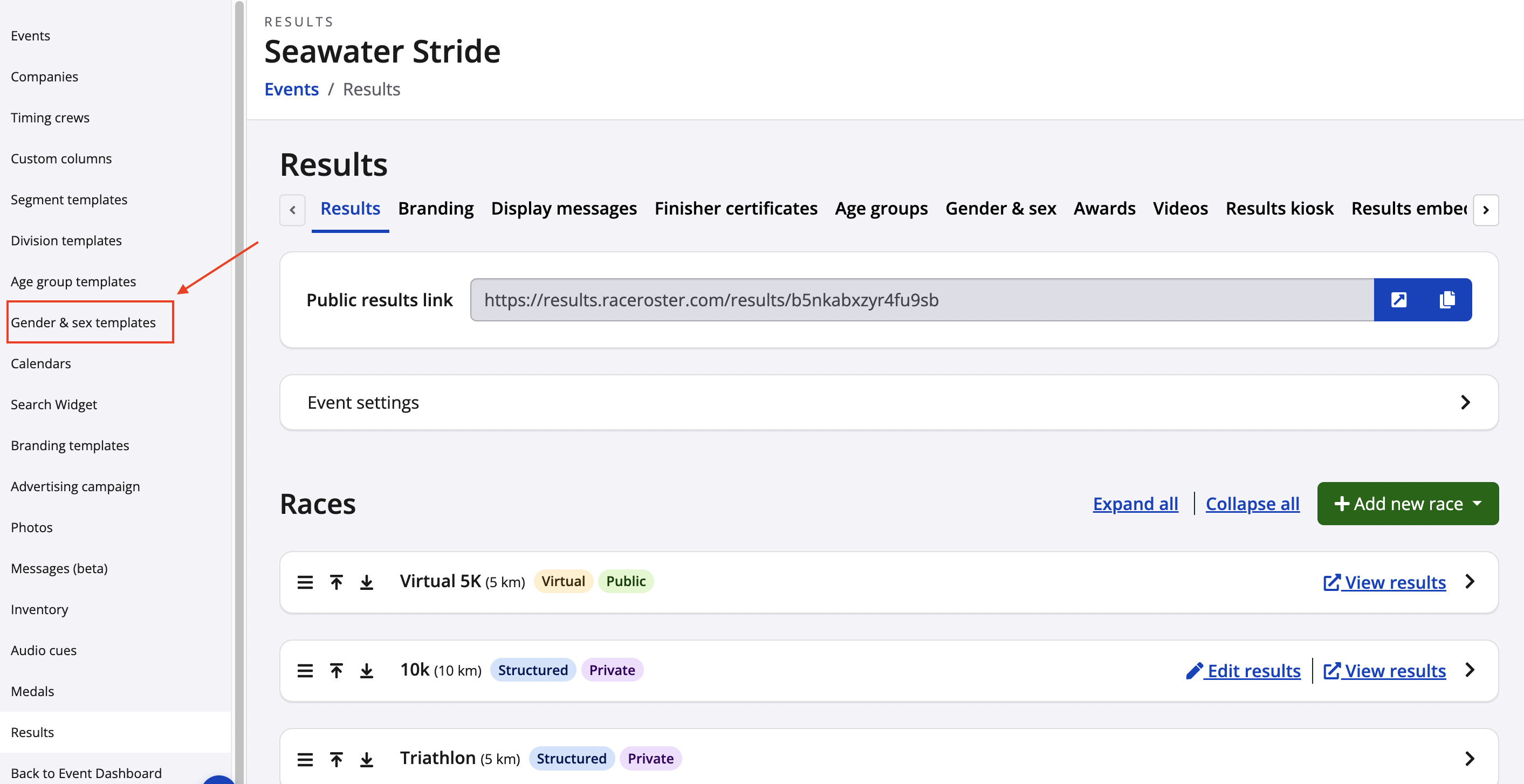 Custom genders can now be created to allow for participants to be listed as any preferred gender within your results leaderboards and race awards. Timers and event organizers can also create gender & sex templates which can be re-used at a later time for future events.