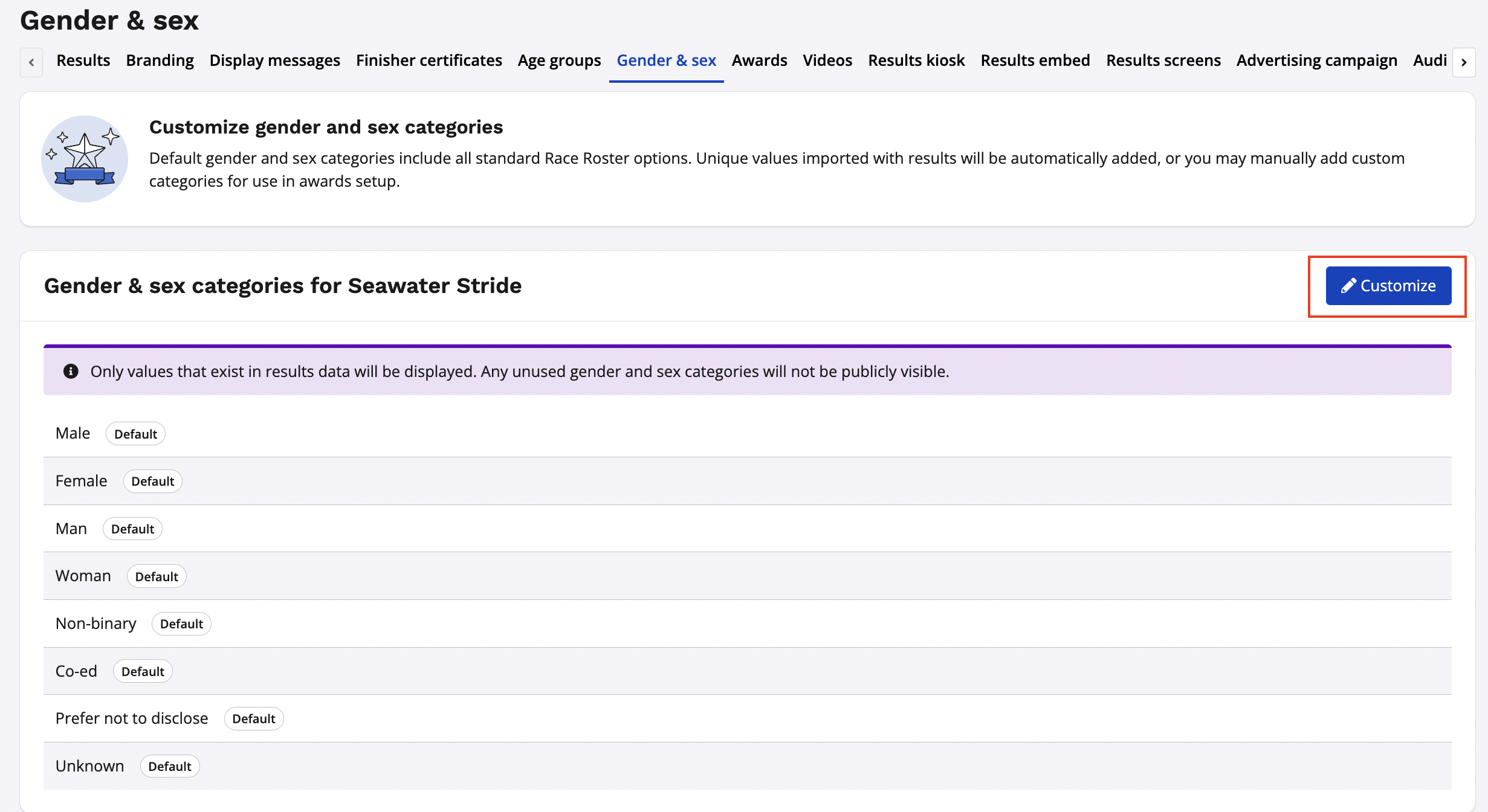 - Our system will add and allow for any custom genders included within the results data to display within results.
