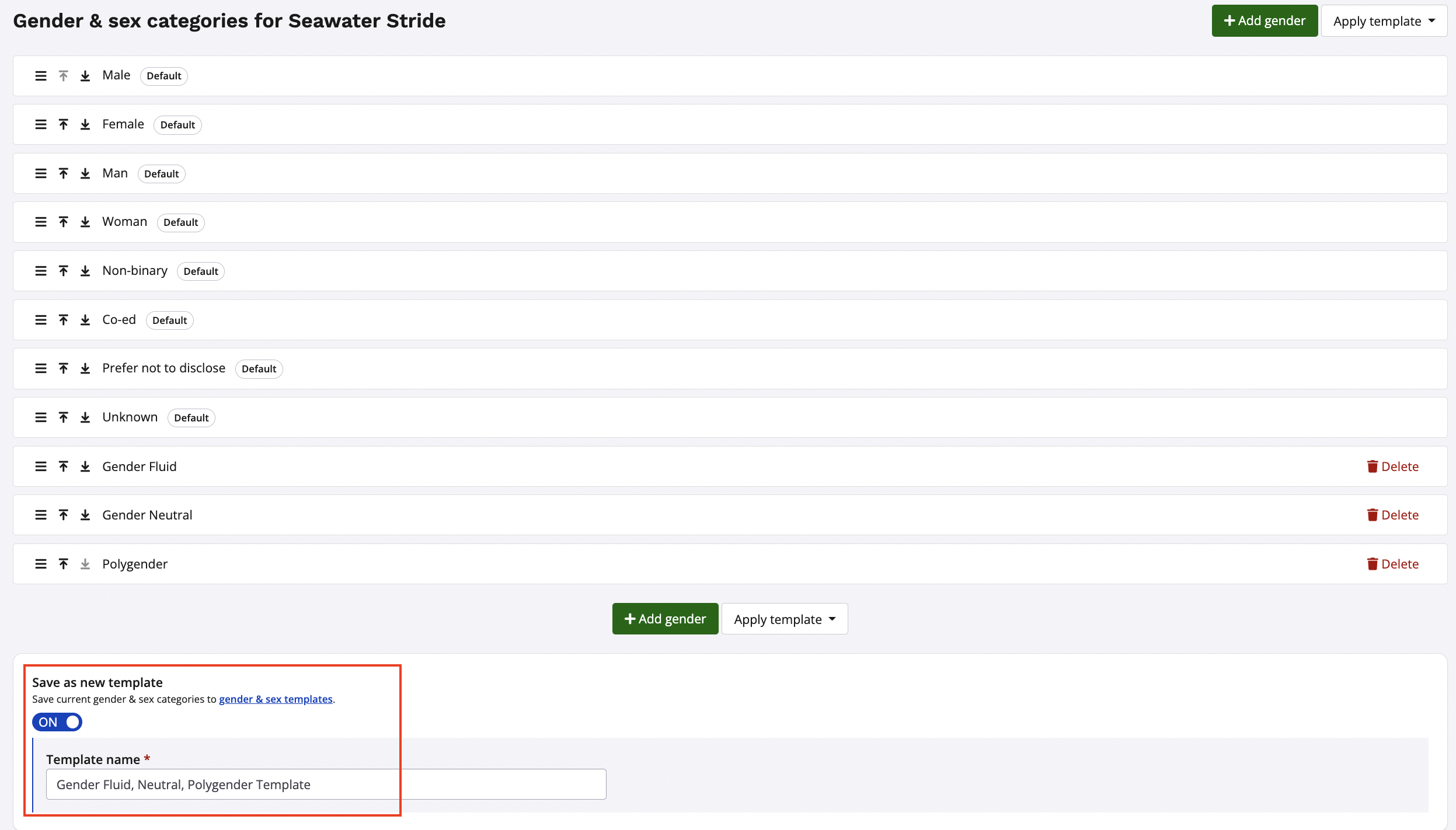 3. From this page, you can click the add gender button to add any custom genders that may exist within your results data that is not listed as one of the default gender options. Once you've added your custom genders, toggle the setting save as new template at the bottom of your page to ON, give your template a name, and then click save at the bottom of the page.