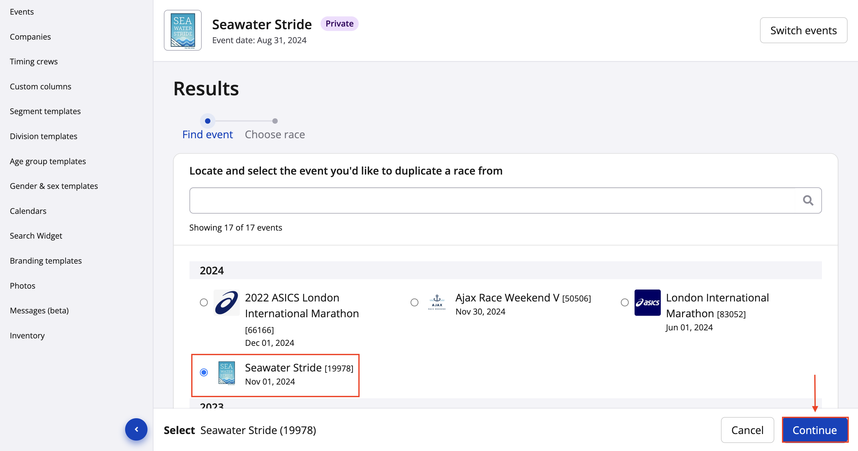 3. Select the event that you'd like to duplicate races and awards from.