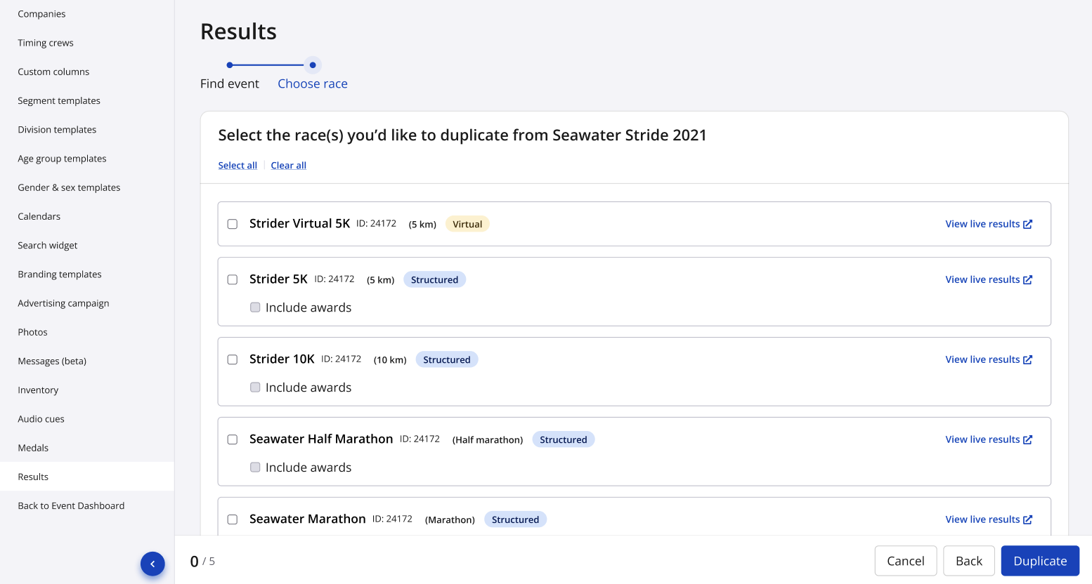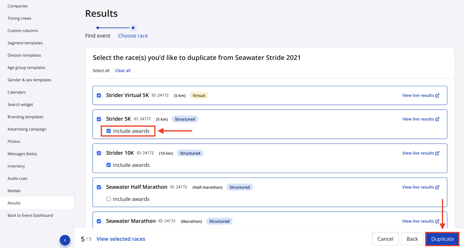 4. Select which races you'd like to duplicate to your existing event. Any races that only have one single award assigned to it will be available to duplicate along with the race by clicking the Include awards checkbox within the race. Click Duplicate in the bottom righthand corner to