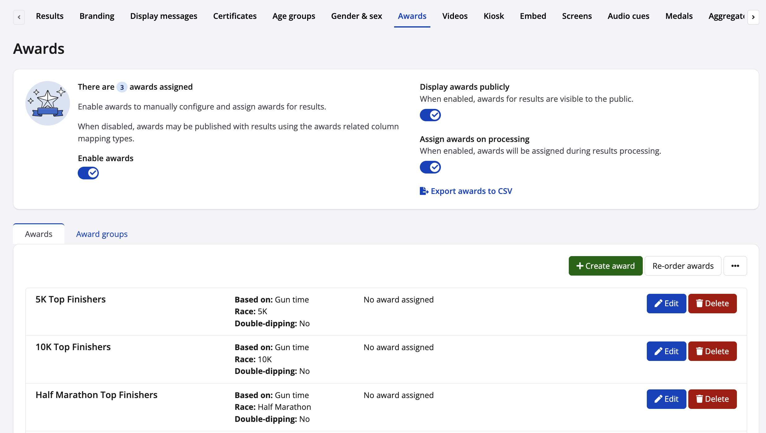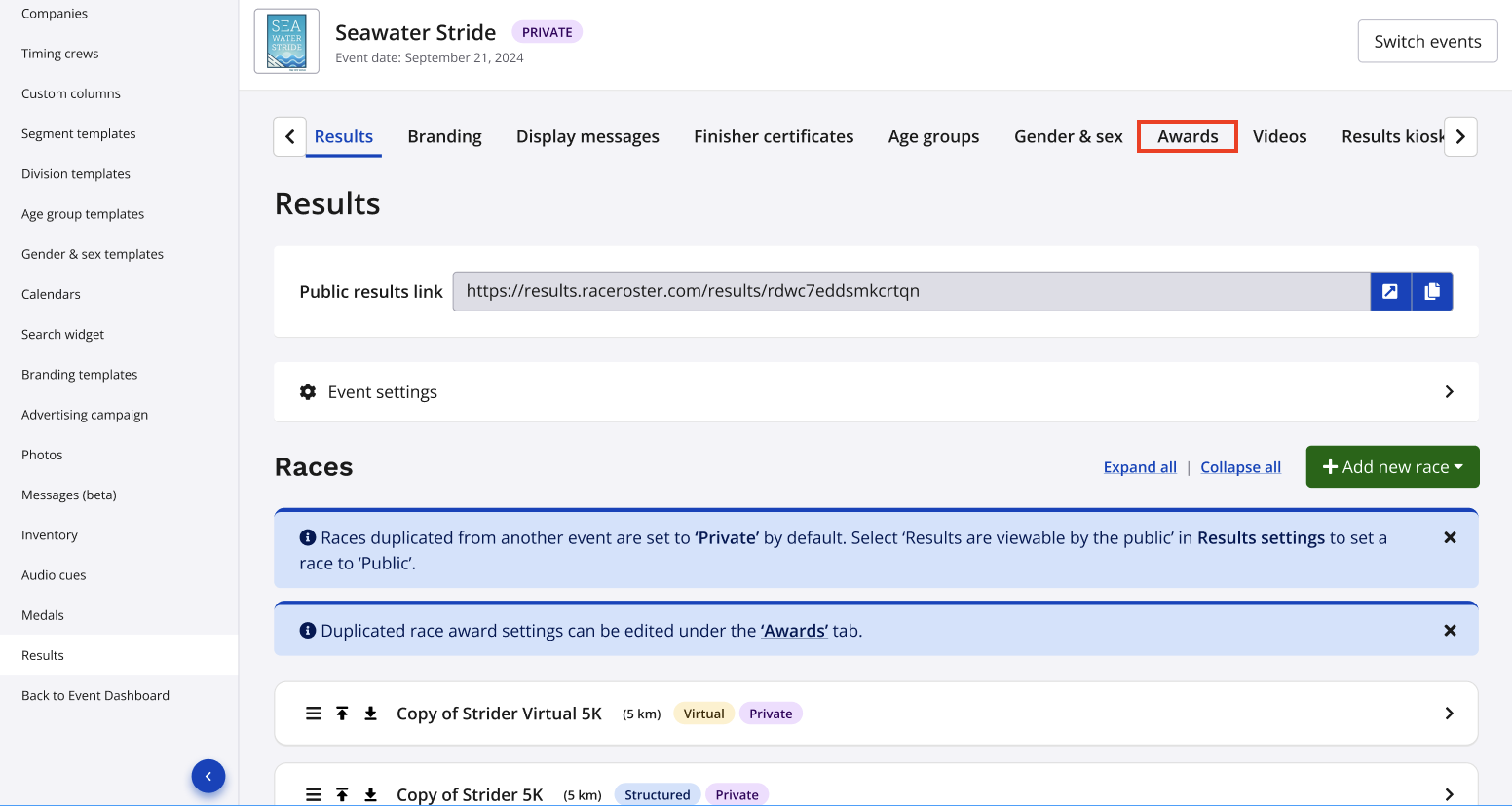 5. After duplication, you will find a copy of all of the selected races within your results dashboard, as well as all duplicated awards within the Awards tab. Awards can be edited further if desired within the Awards tab.