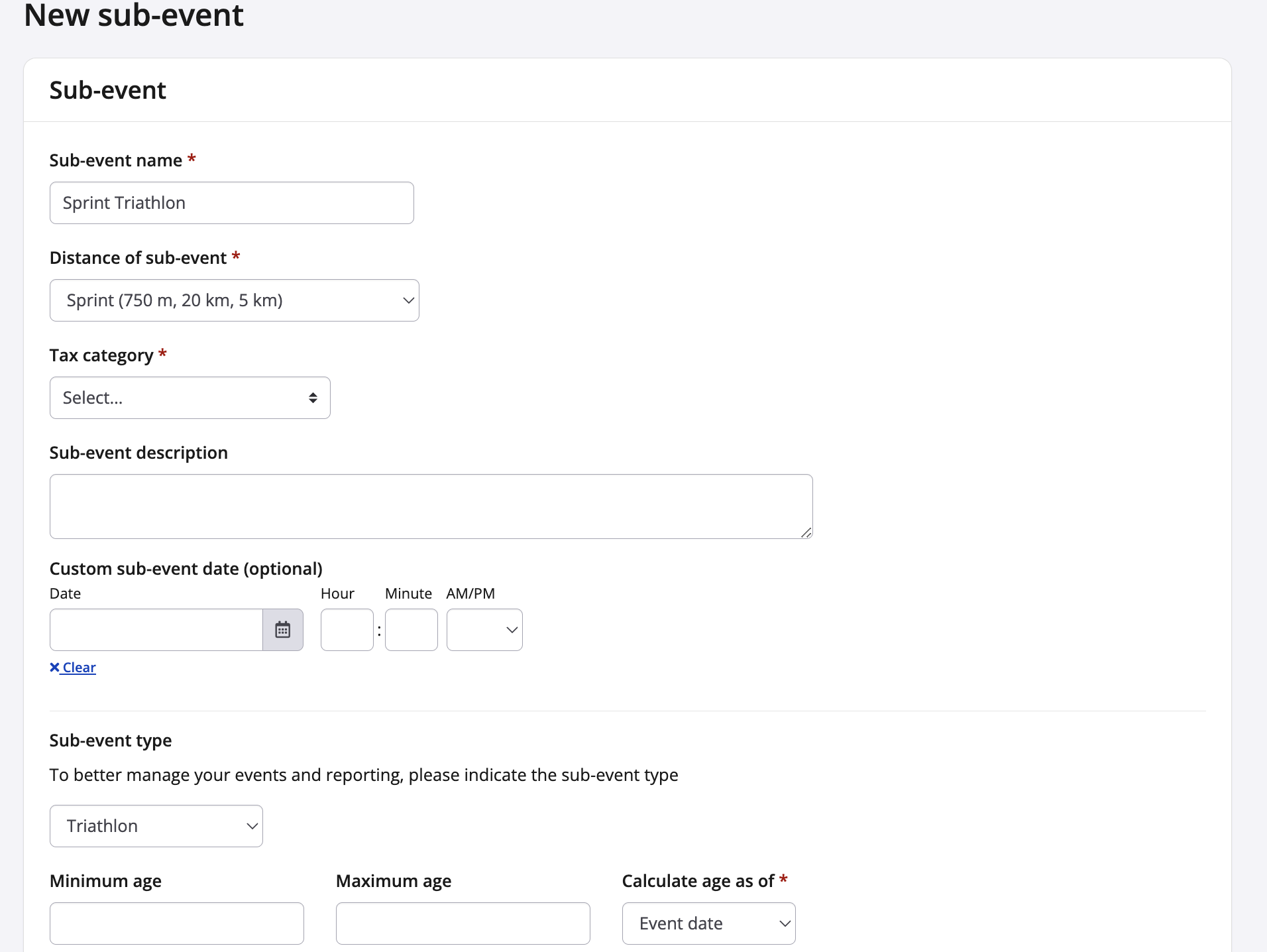 6. Give your sub-events a name, as well as a sub-event type and distance of sub-event that are compatible with USAT's approved sub-event types and distances. Click save once complete.
