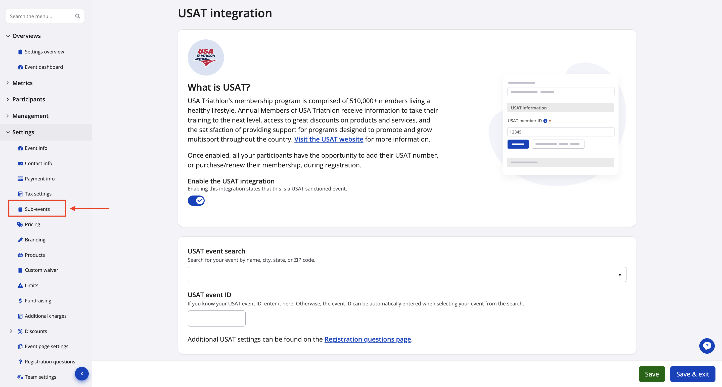 4. After connecting your event to the USAT system, click on Settings -> Sub-events to begin configuring your event's sub-events to connect to USAT's system.