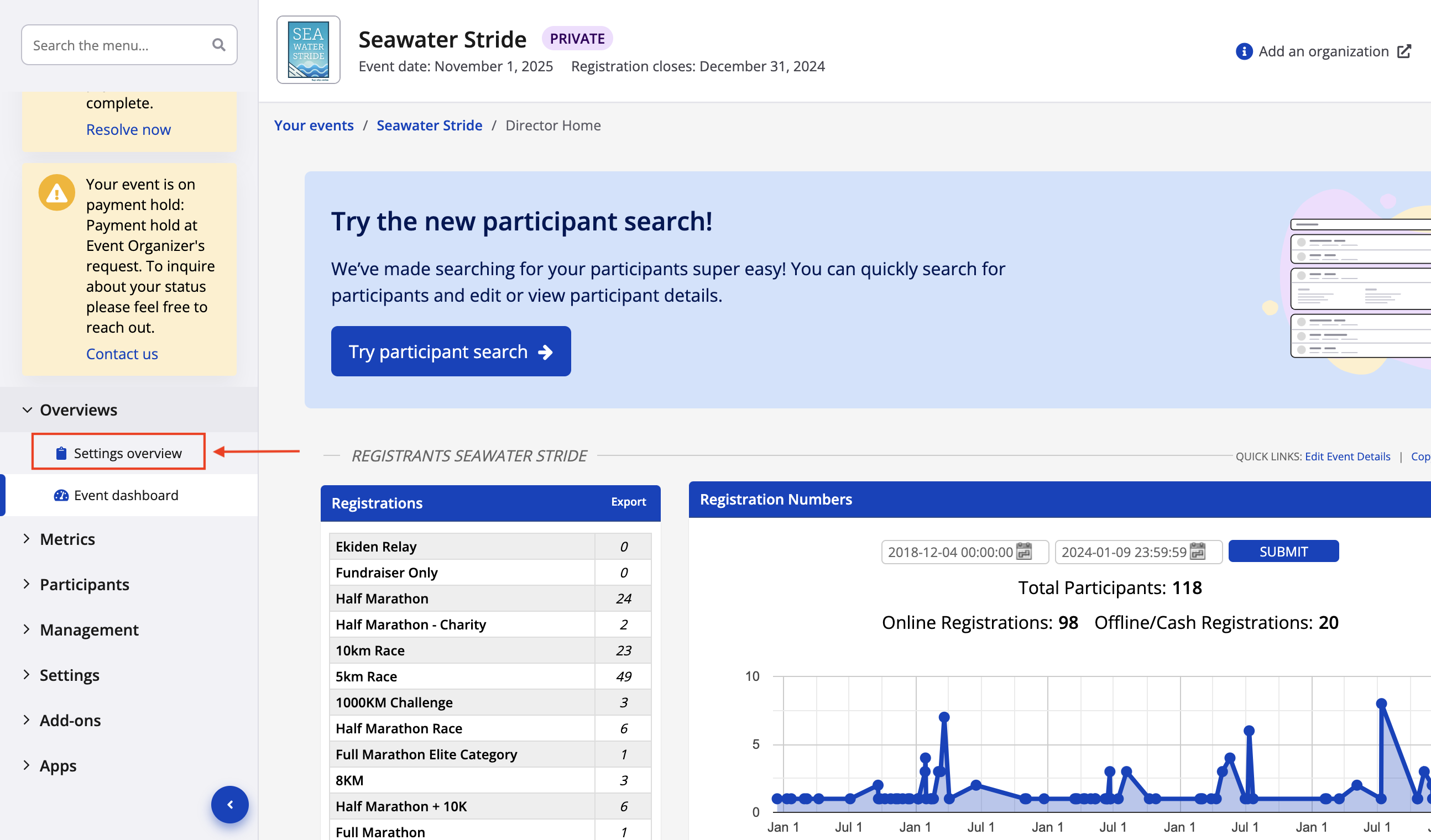 1. From your event dashboard, click on Overviews -> Settings overview from the lefthand side menu.