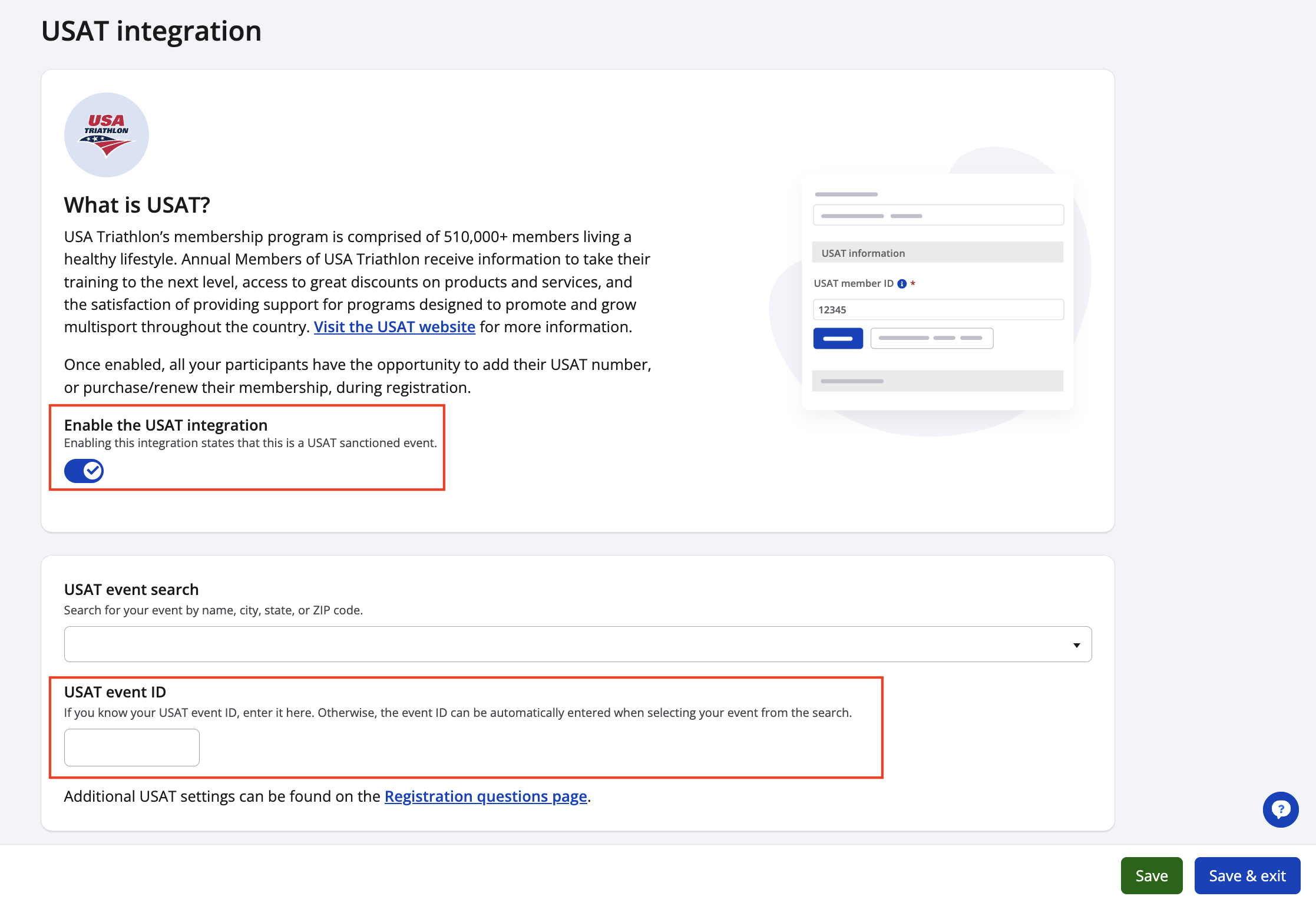 3. From your USAT settings, enter in your USAT event ID number and click save to connect your Race Roster event page to the USAT system. (Please note: your event's USAT ID number can be found within the USAT system, it is not retrievable within Race Roster).