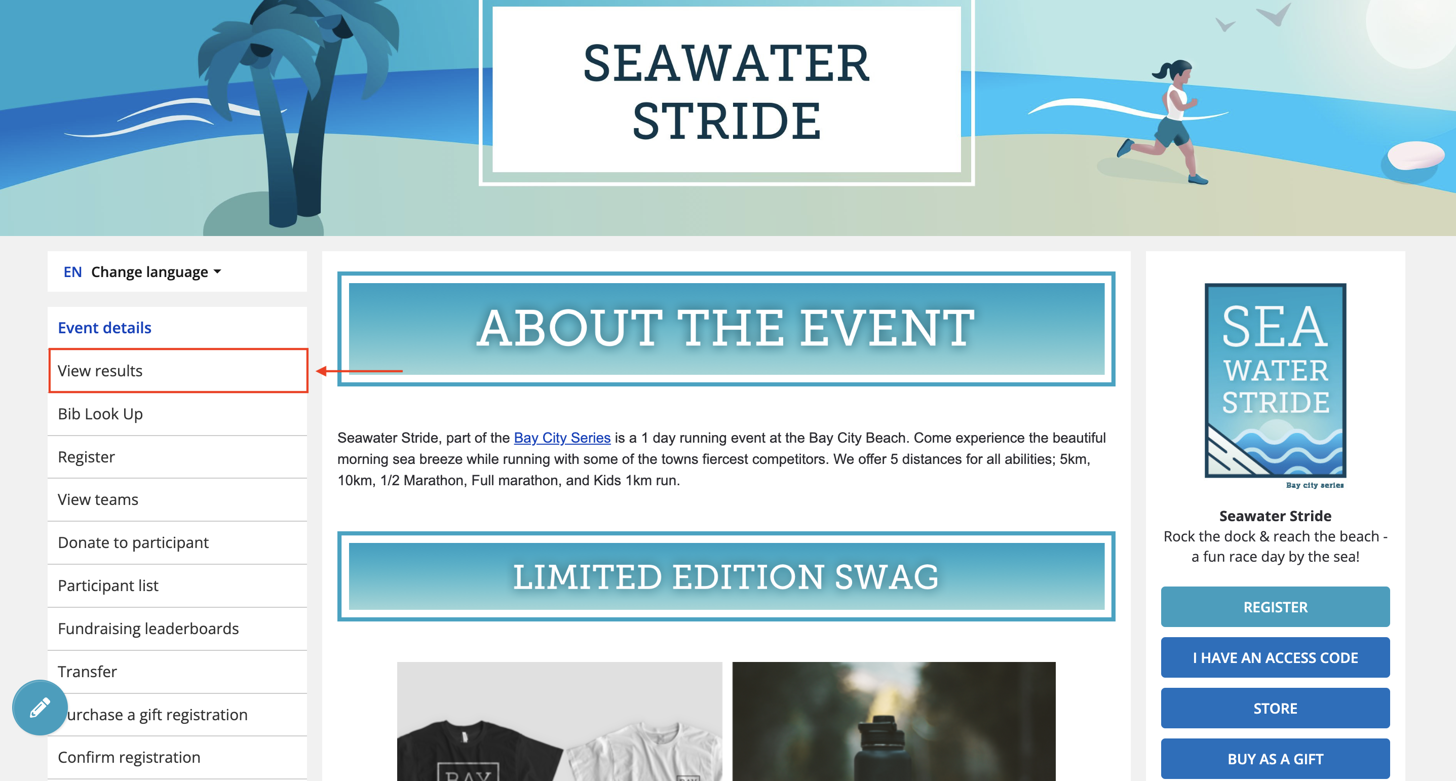 1. Navigate to the event page of the race that you wish to track your runner from (or, you can search for events on Race Roster). Click on the View results sidebar link (top dropdown on mobile devices) to navigate to the event's results page.