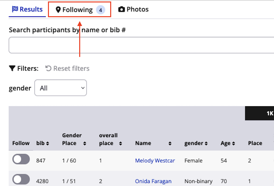 3. Click on the new Following tab from the top of the results table. As you follow more participants using the toggles, the number displayed beside the Following tab will increase (denoting the number of participants currently being followed). You can follow a maximum of 10 participants per race.