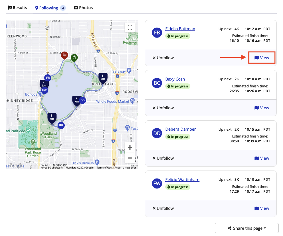 4. Within the Following tab, you will be able to track the estimated progress for each of the selected runners as they progress through the race.