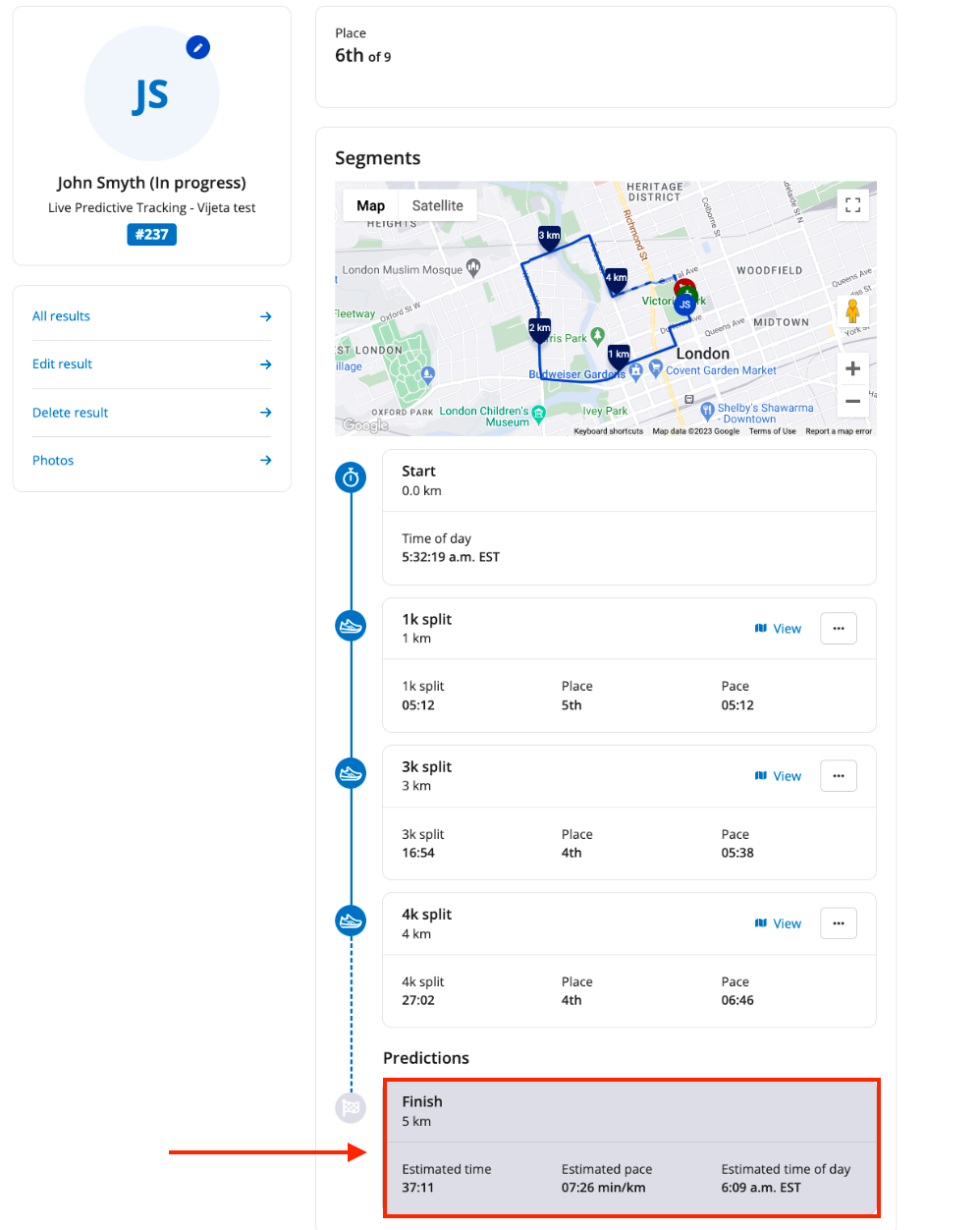 Race Roster offers the ability for event organizers to set up predictive tracking for participants in a race. This feature allows members of the public to view real-time estimations for when a participant will complete their race, during the course.