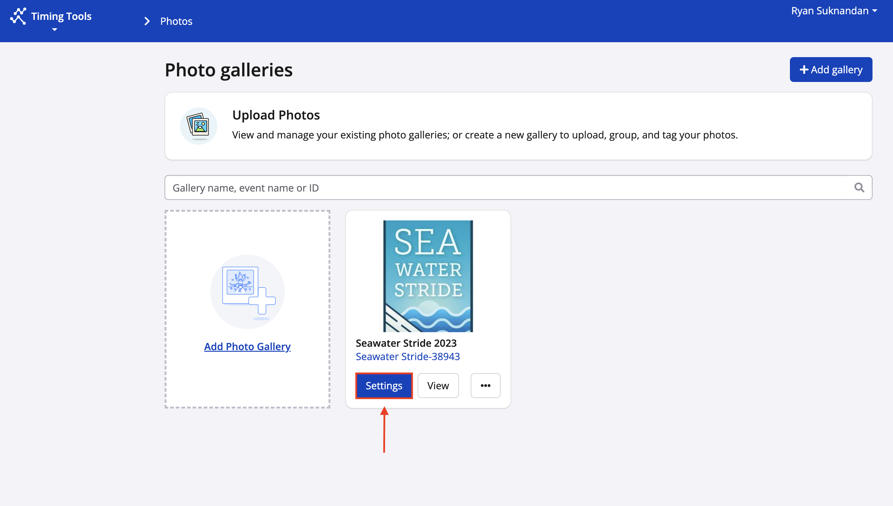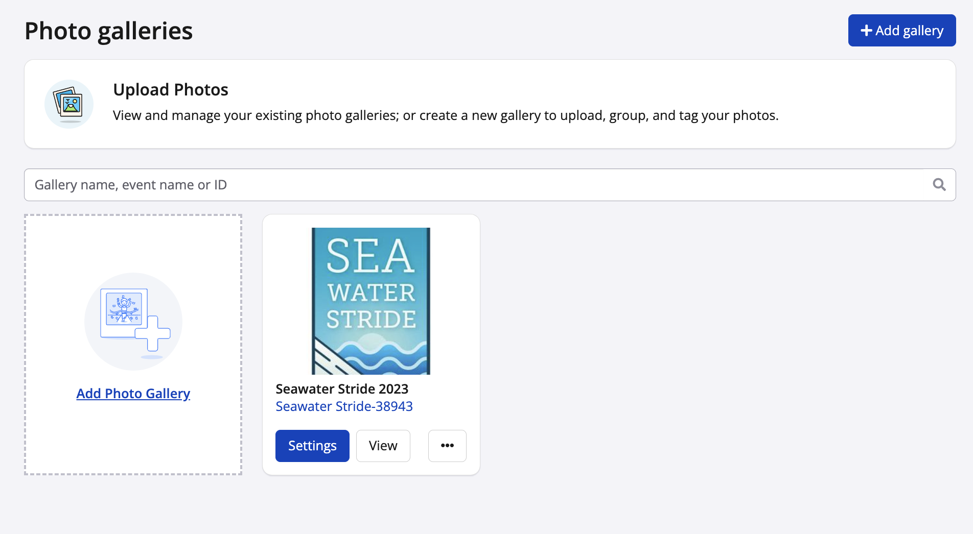2. Within your Photos settings, select the gallery you'd like to add a collaborator to and click on the settings button. If you have no existing photo galleries, please reference our guide on how to create a photo gallery.