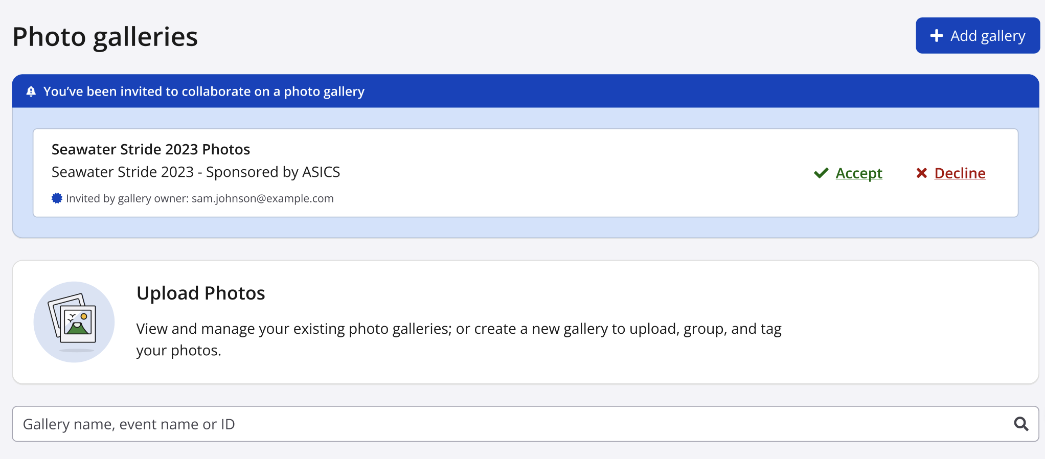 Race Roster's photos application allows for photo gallery creators to add collaborators (ex: other staff members) to edit and add photos to their gallery. We have updated the collaborator invite process to automatically notify access recipients by email, and provide an easy acceptance flow to complete the access approval process.