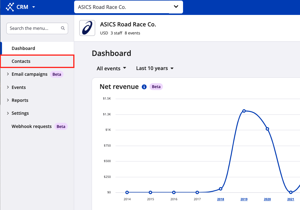 1. From the organization dashboard, navigate to the lefthand menu and select "Contacts".