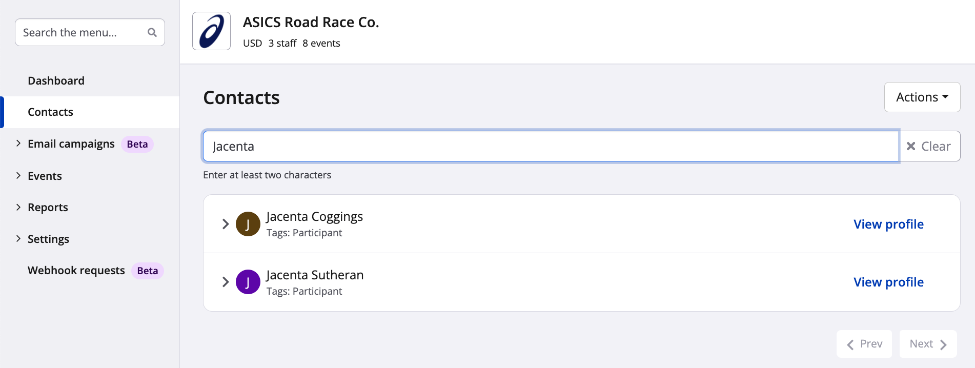 2. From the contacts search page, use the contact search bar to enter a key word common to the two contacts you wish to merge. Make sure that at least the two are visible on the page.