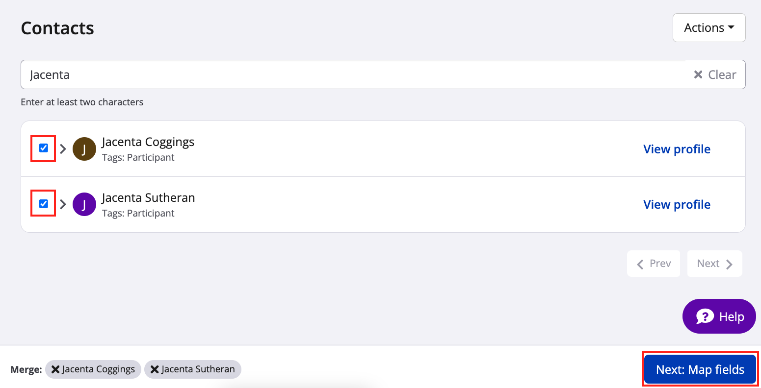 3. Use the "Actions" dropdown on the top right to select "Show contact merging". Then, select the two contacts using the checkboxes on the left and click the blue "Next: Maps fields" button on the bottom right.