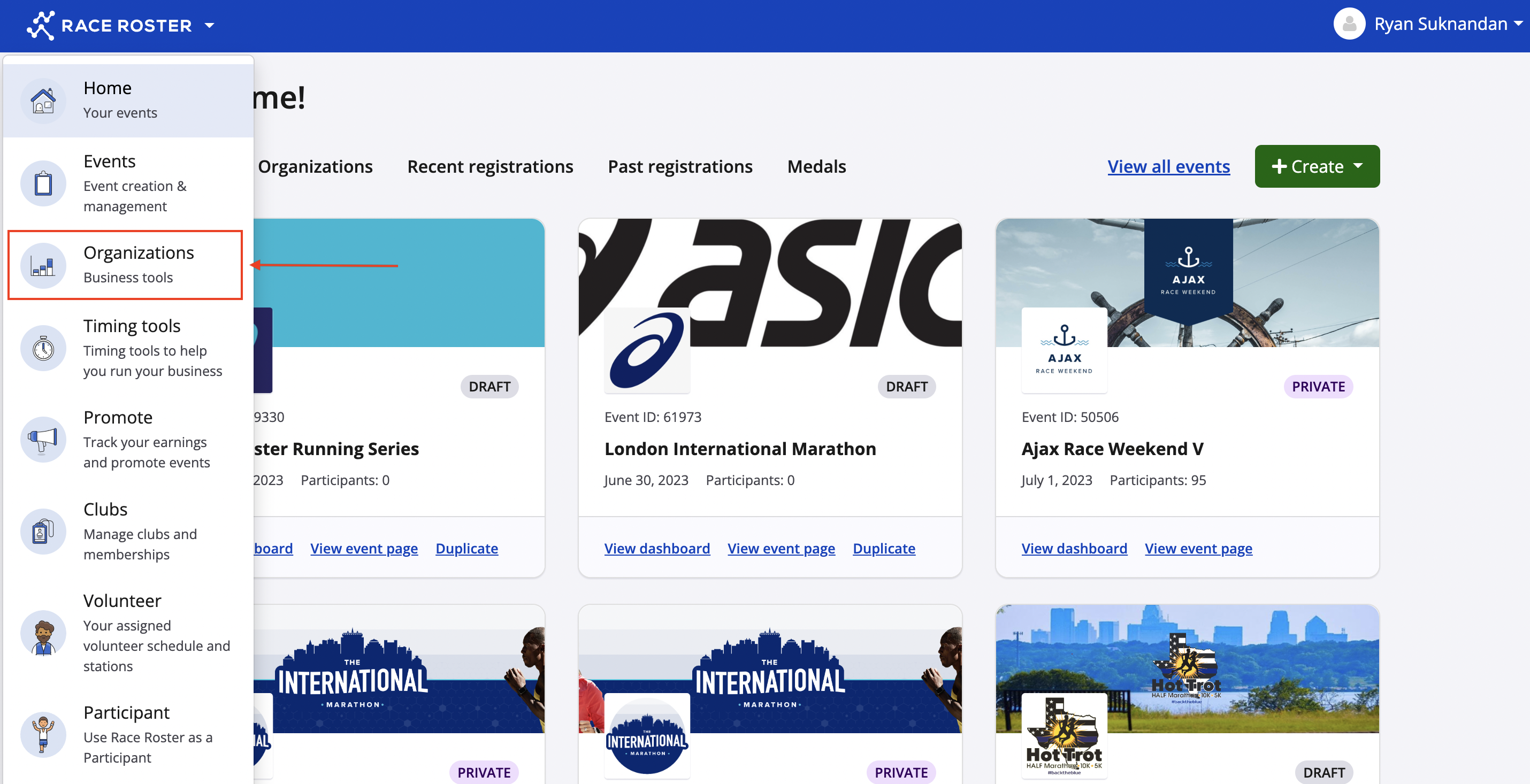 This article will outline the different ways to find and navigate across your different organizations that you've created when logged into your Race Roster account.