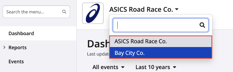 After creating or joining multiple organizations on Race Roster, you can toggle between your different organizations directly from your organization's dashboard.