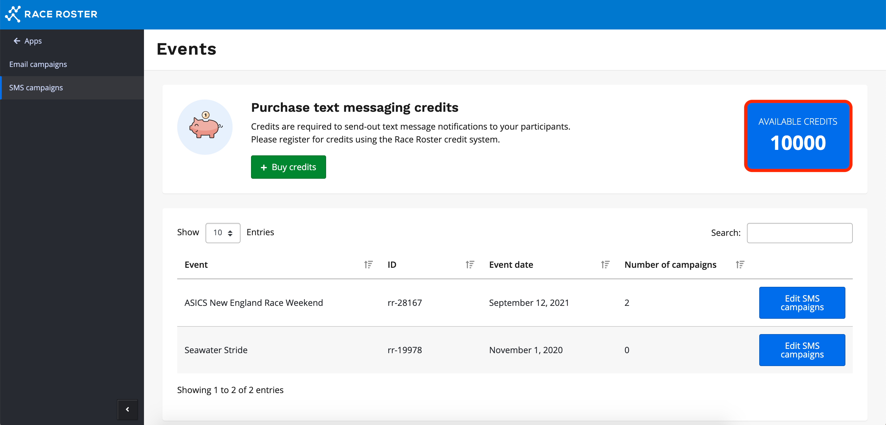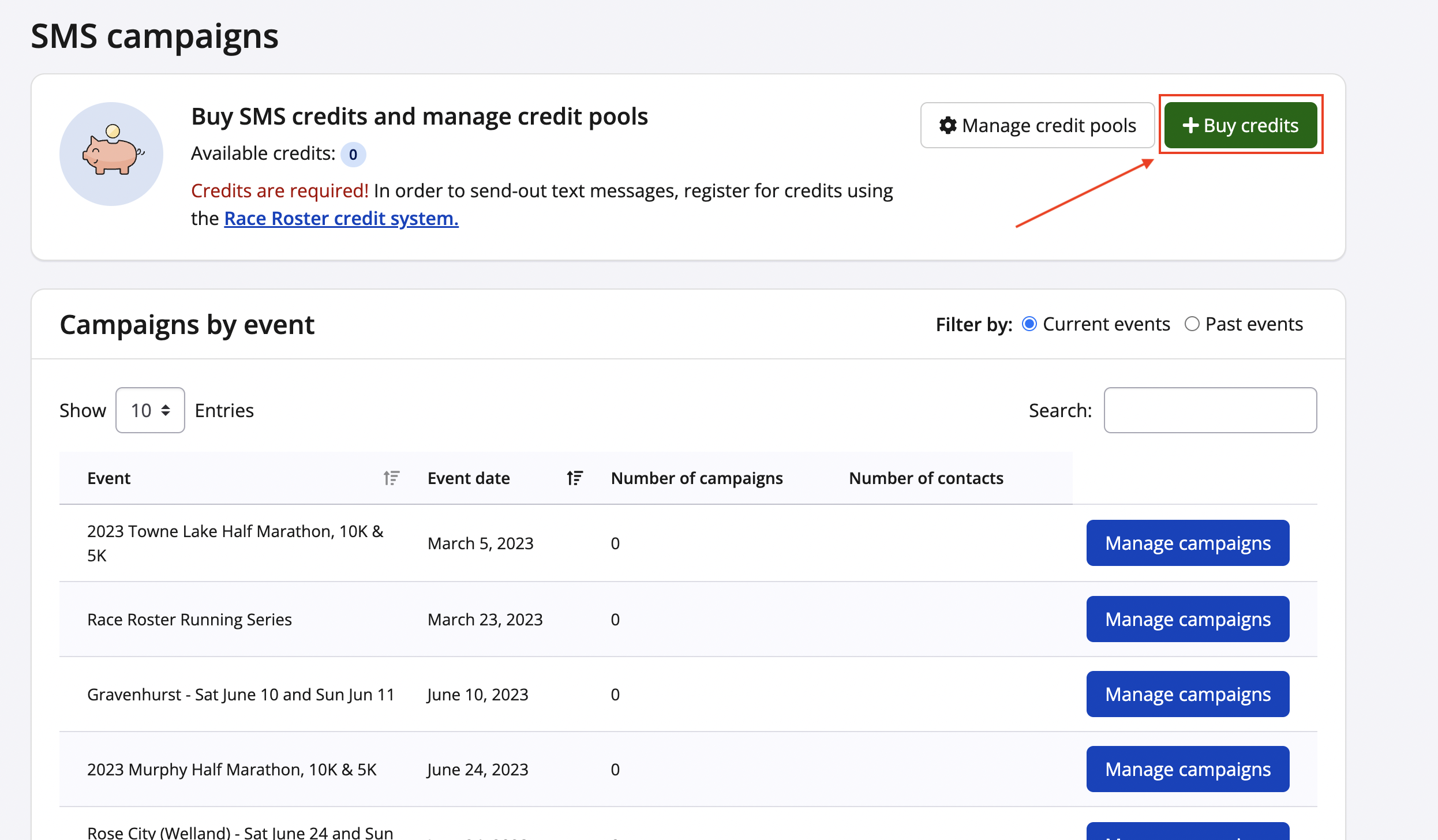 You will then be directed to the Race Roster Text Message Credits page where you will be able to purchase credits.