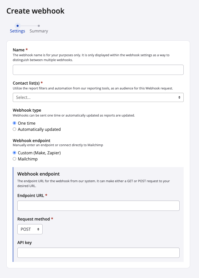 - Custom (Make, Zapier, etc): If the webhook endpoint is a compatible third party provider, a manual process can make the connection possible. Enter the endpoint URL, select GET, POST or PUT for the request method and (optionally) enter the API key.