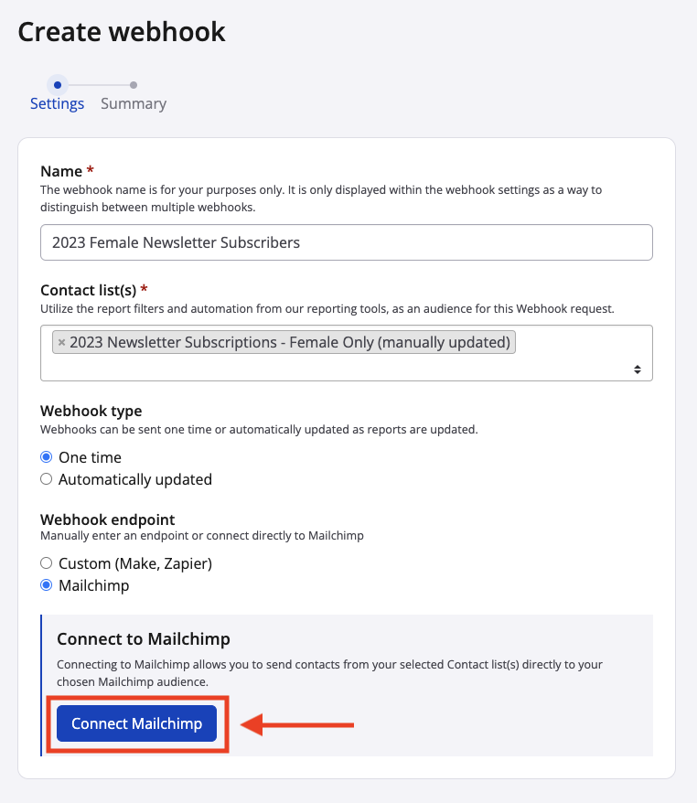 5. Name the webhook. The name is for you and your organization's staff to distinguish between different requests. For example, you might create one webhook request containing female contacts who opted into receiving your organization's newsletter across all 2023 Race Roster events. Then, the following year you might want to do the exact same thing. In this case, you might call the first webhook "2023 female newsletter subscribers" and the second "2024 female newsletter subscribers".