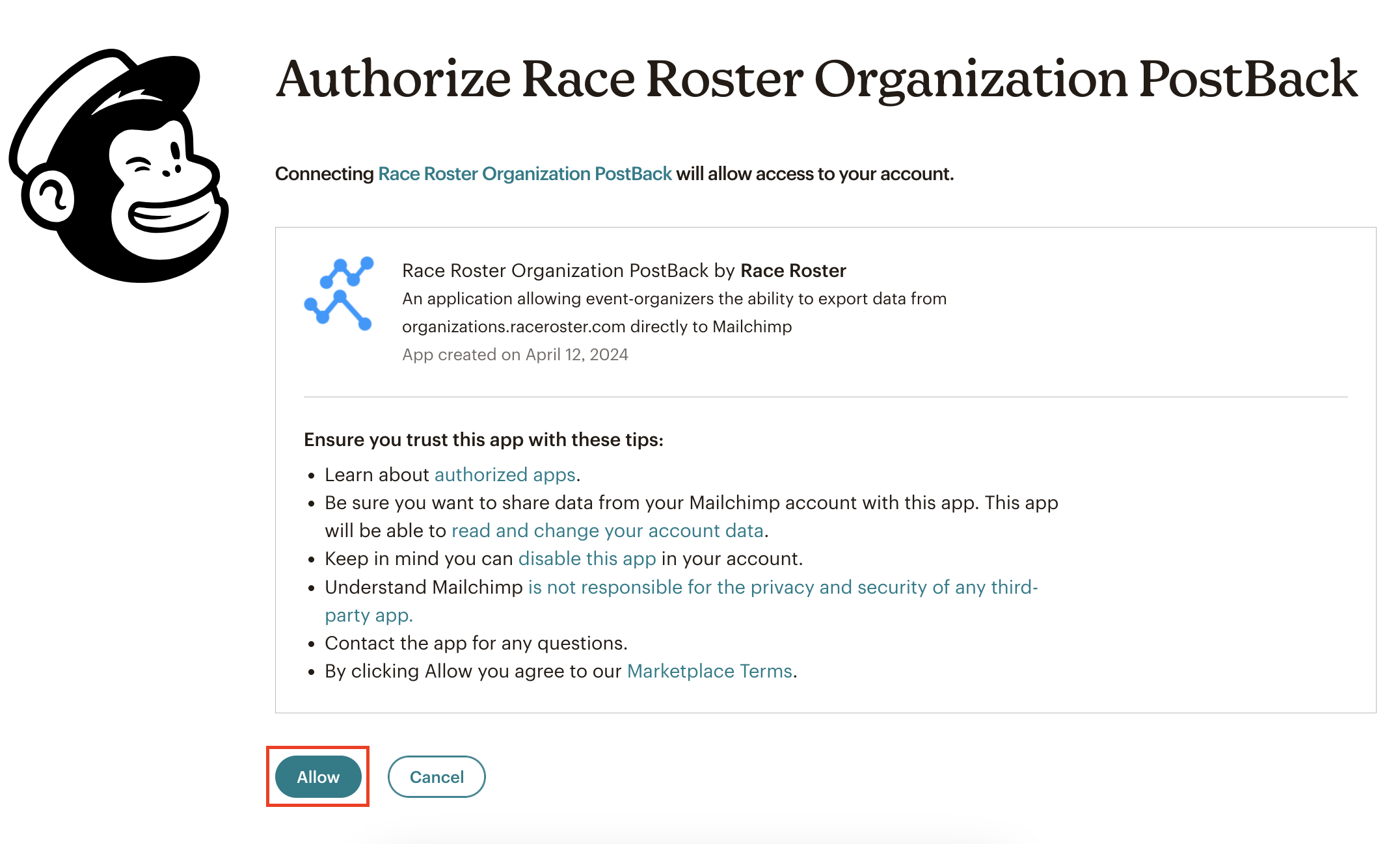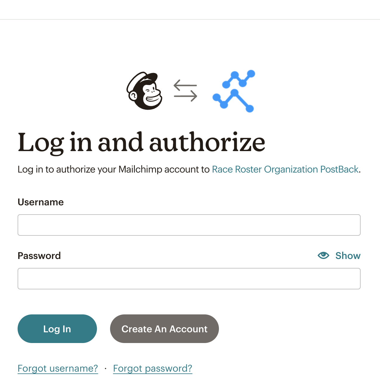 - Mailchimp: Race Roster offers an integration with Mailchimp. Click "Connect Mailchimp". On the next screens, enter your Mailchimp account login credentials and authorize the Race Roster connection. Then, select a Mailchimp audience within your account to use as the contact data endpoint. Finally, review the summary and click "Send webhook".