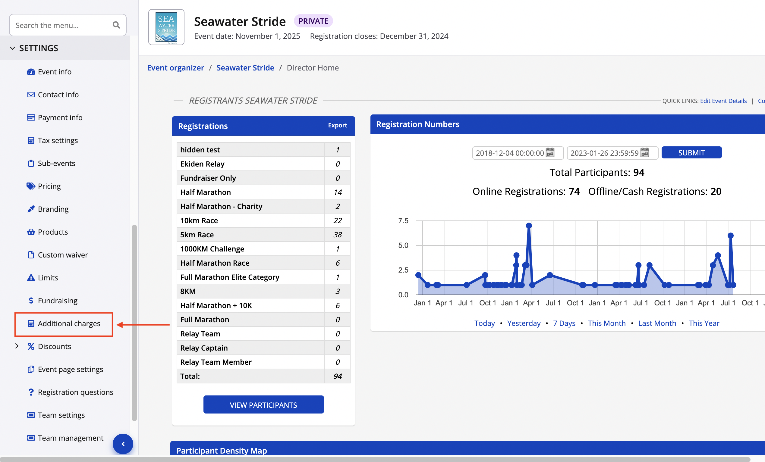 1. From you event dashboard, navigate to "additional charges" found under the "settings" tab on the left-hand side menu.