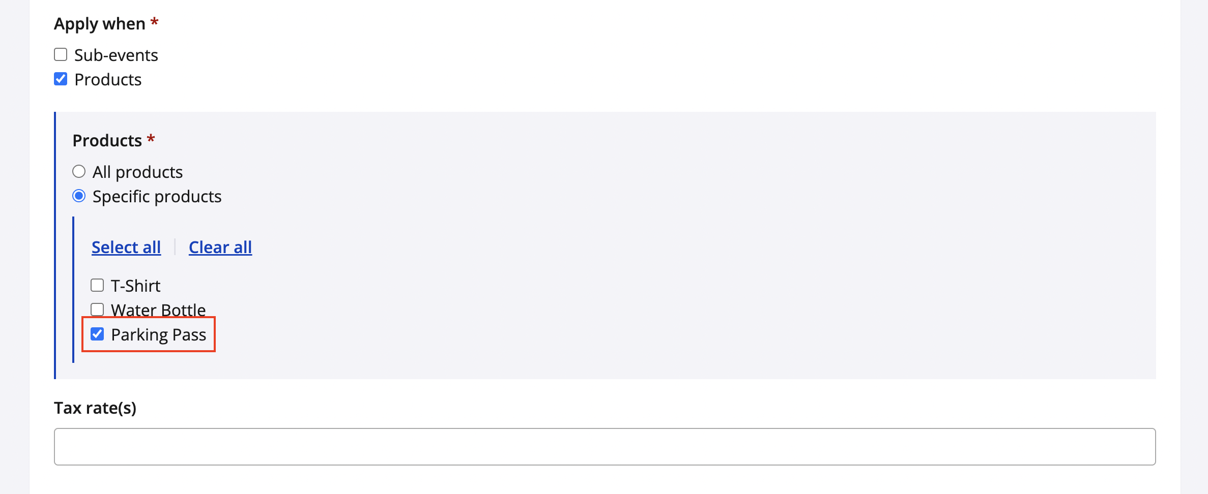 4. Choose if this additional charge should be applied to certain sub-event selections, specific products/product options, or both if necessary.