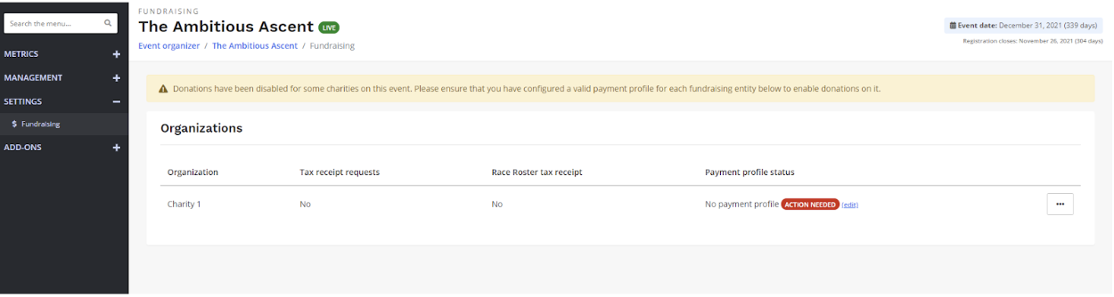 - Back Under Settings->fundraising, your charity should now appear under Organisations. You will note that the payment profile needs action