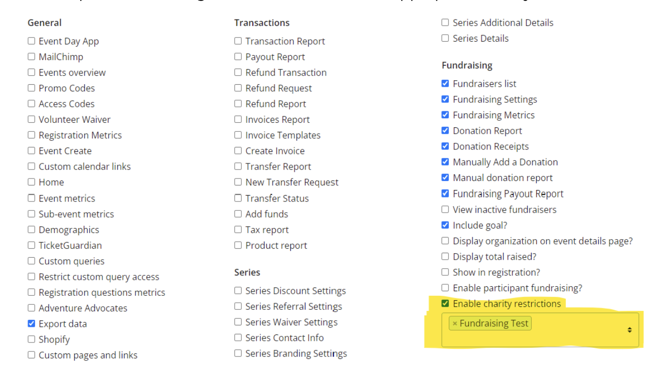 - Update the settings to restrict access to the appropriate charity for the fundraising coordinator